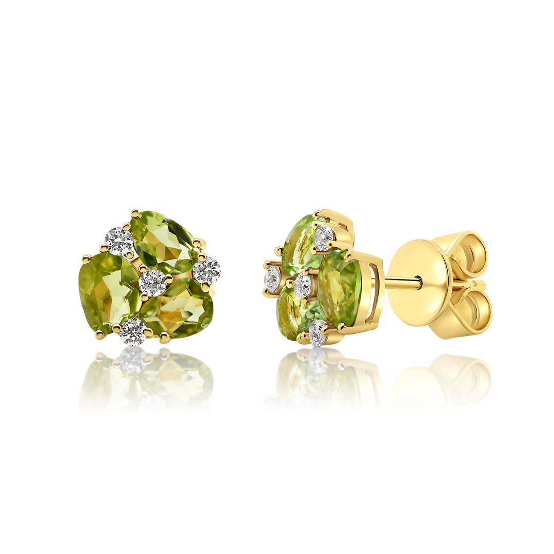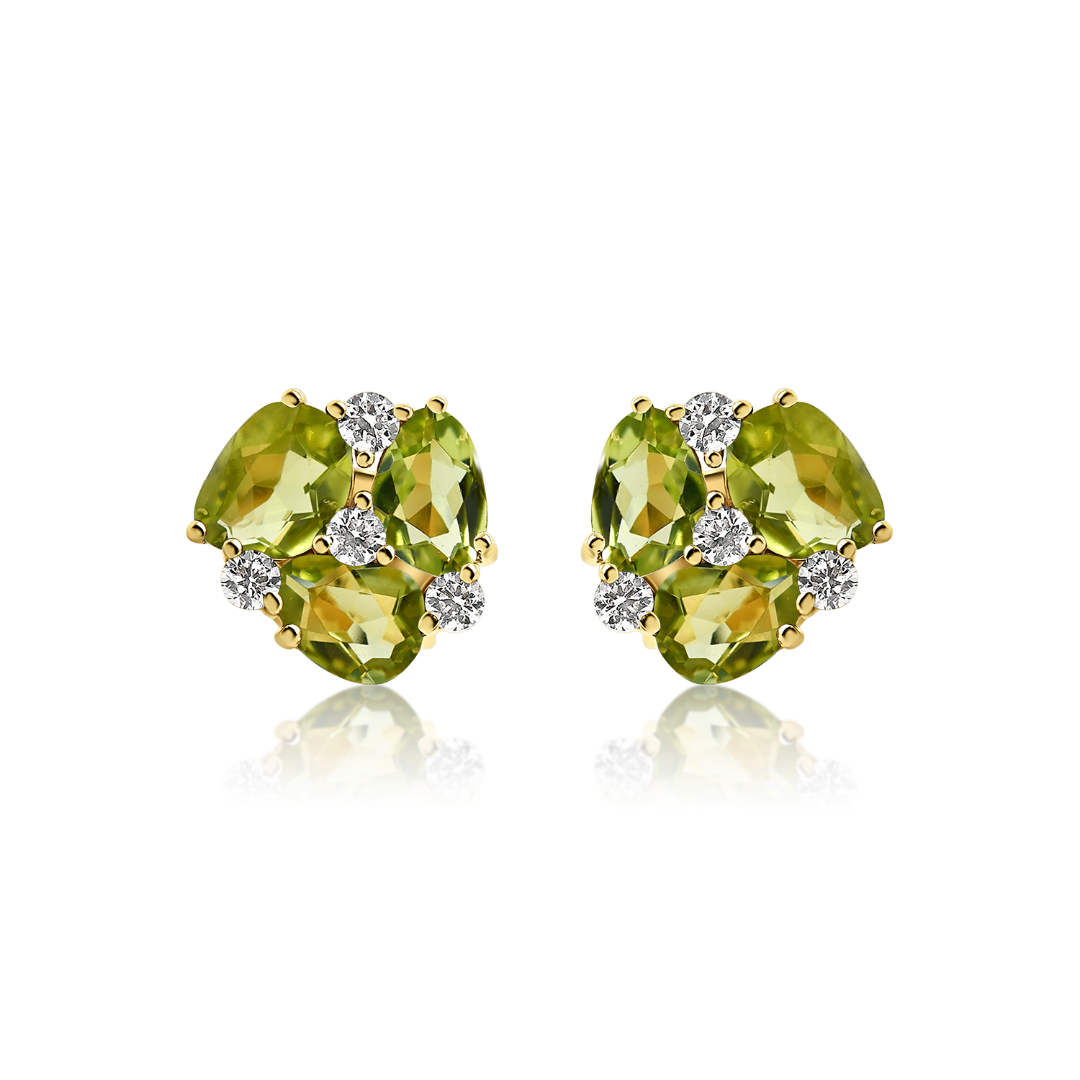 Cercei din aur galben de 18K, cu Peridot verde de 1.40ct și 8 Diamante Round Brilliant de 0.15ct.