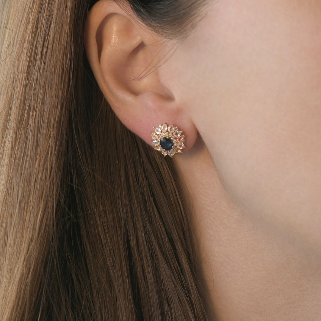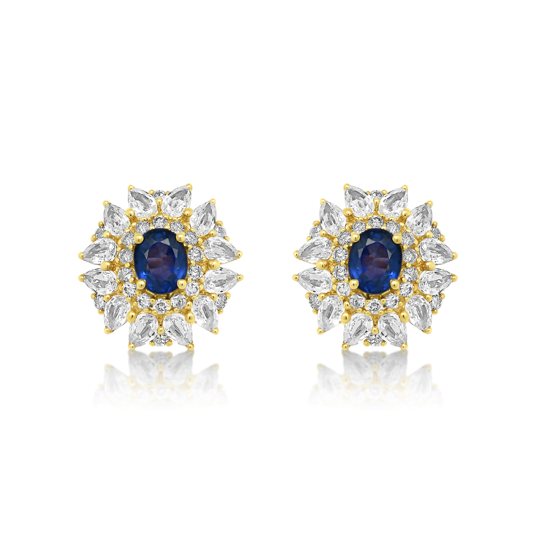 Cercei din aur galben de 18K cu două Safire albastre de 1.16ct, Safire incolore de 2.0ct. și Diamante naturale Round Brilliant de 0.36ct.