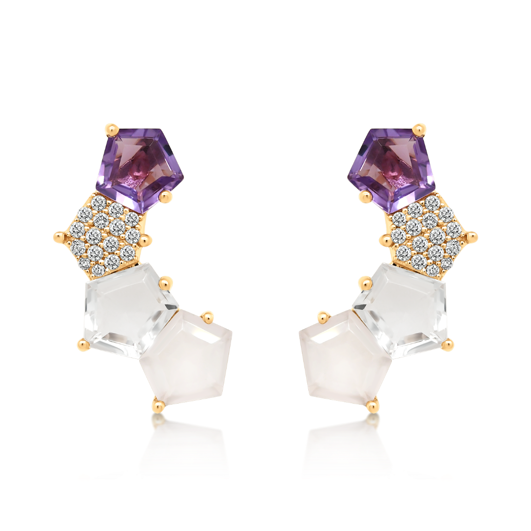 Cercei din aur roz de 18K cu două Ametiste de 1.68ct, Quartz alb de 1.95ct, Quartz roz de 1.78ct și 32 de Diamante Brilliant cut de 0.22ct.