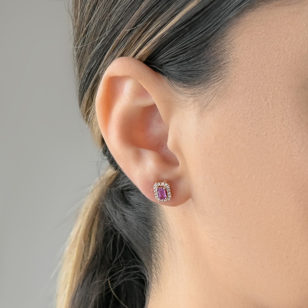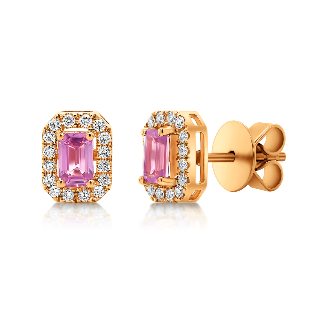 Cercei din aur roz de 18K încrustați cu 32 de Diamante naturale cu o greutate totală de 0.24ct și 2 Safire roz de 0.85ct.