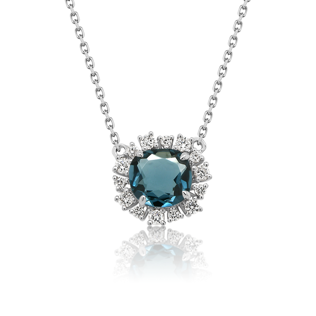 Lanț din aur alb de 18K și pandantiv cu un London Blue Topaz de 0.86ct și 14 Diamante Round Brilliant de 0.147ct.
