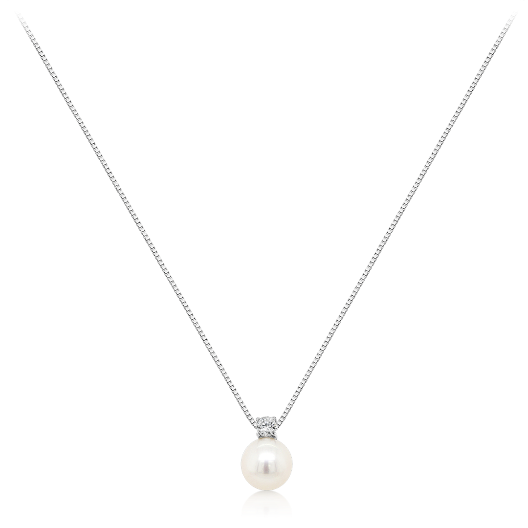 Lanț din aur alb de 18K și pandantiv cu un Diamant Round Brilliant de 0.02ct și Perlă de cultură.