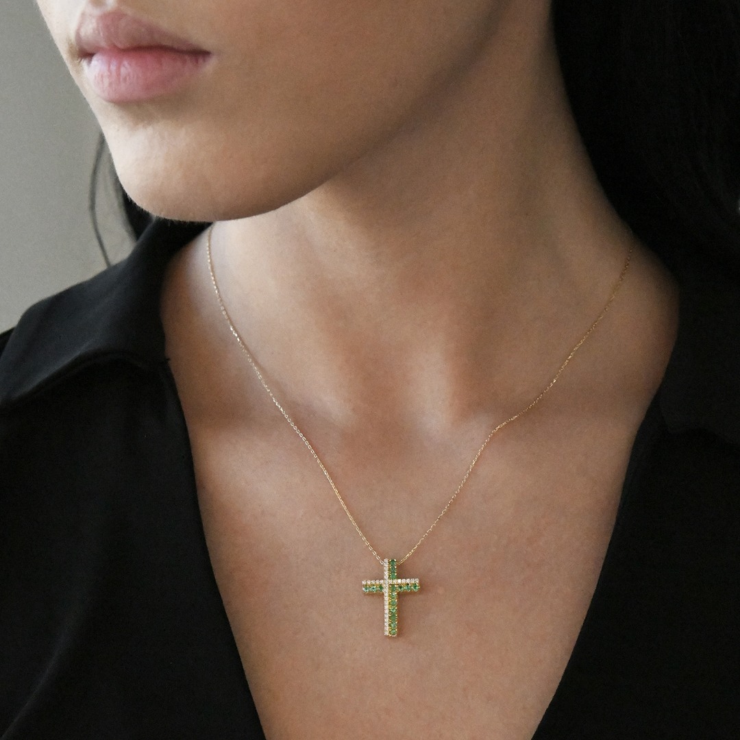Lanț din aur galben de 18K și pandantiv cruce cu Smaralde și Diamante naturale.