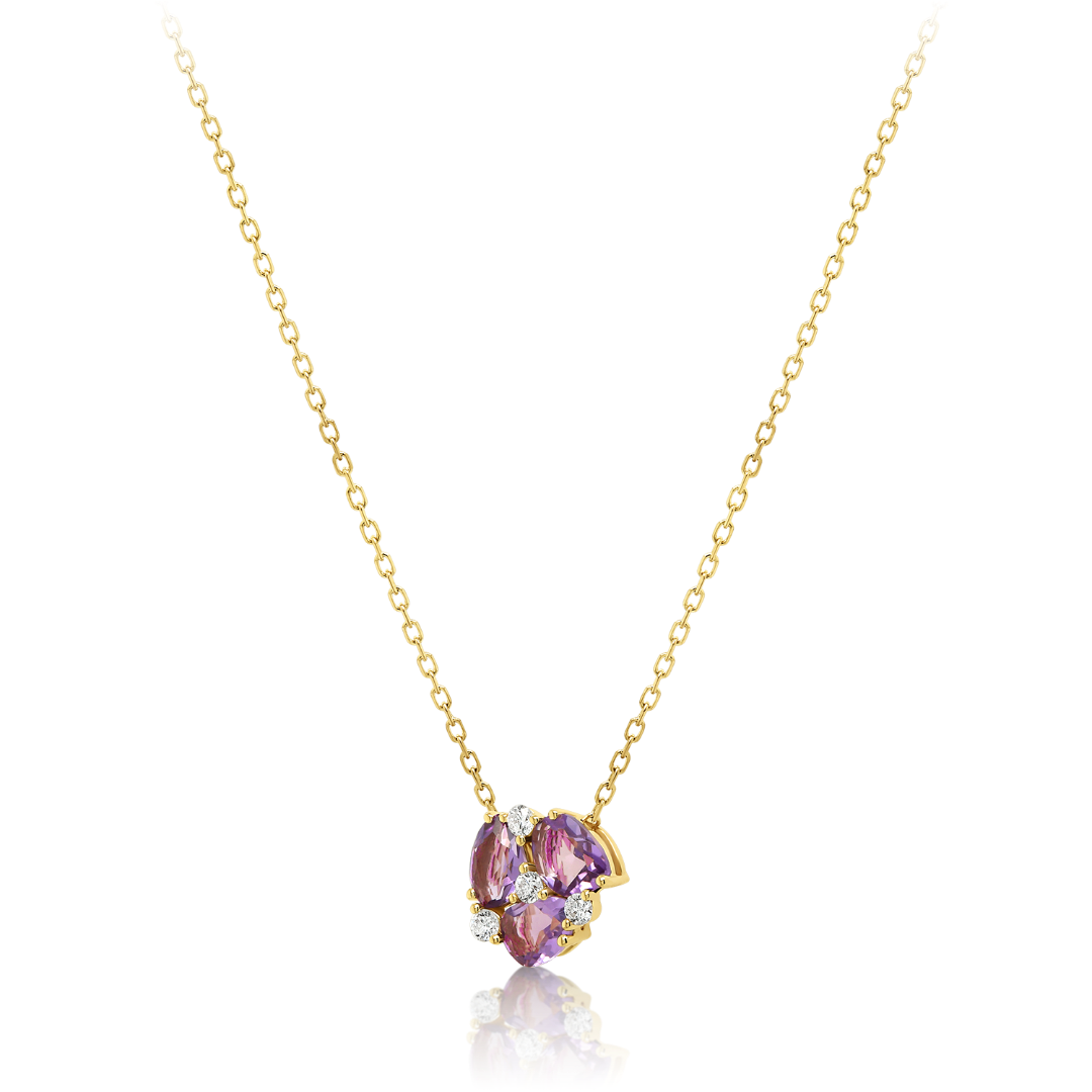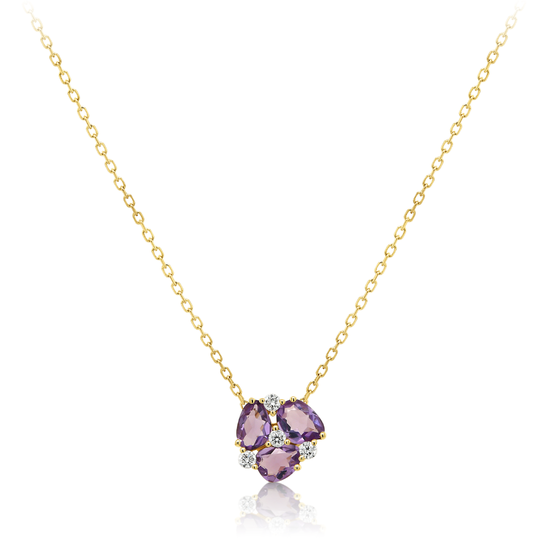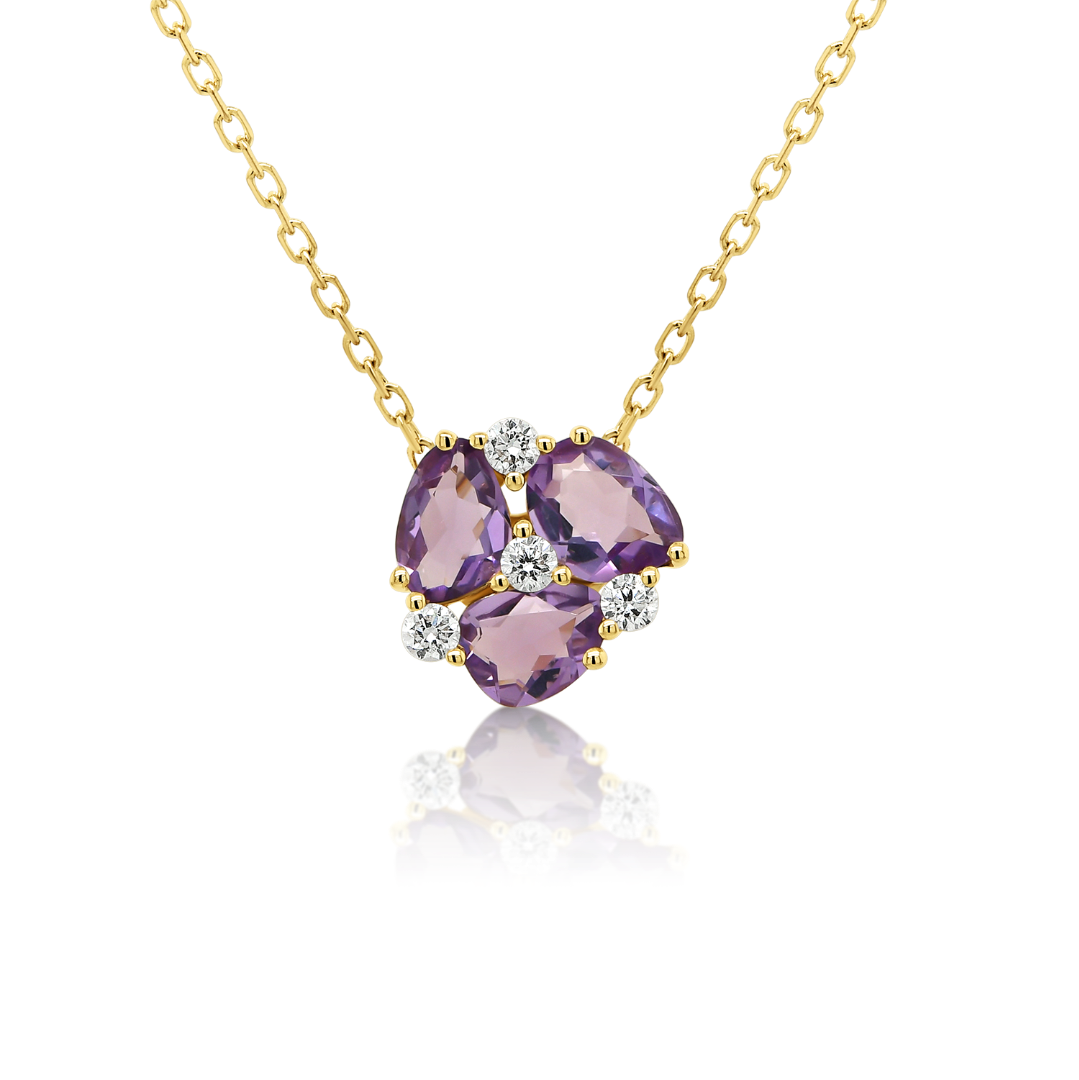 Lanț din aur galben de 18K și pandantiv cu 3 Ametiste de 0.58ct și 4 Diamante Round Brilliant de 0.072ct.