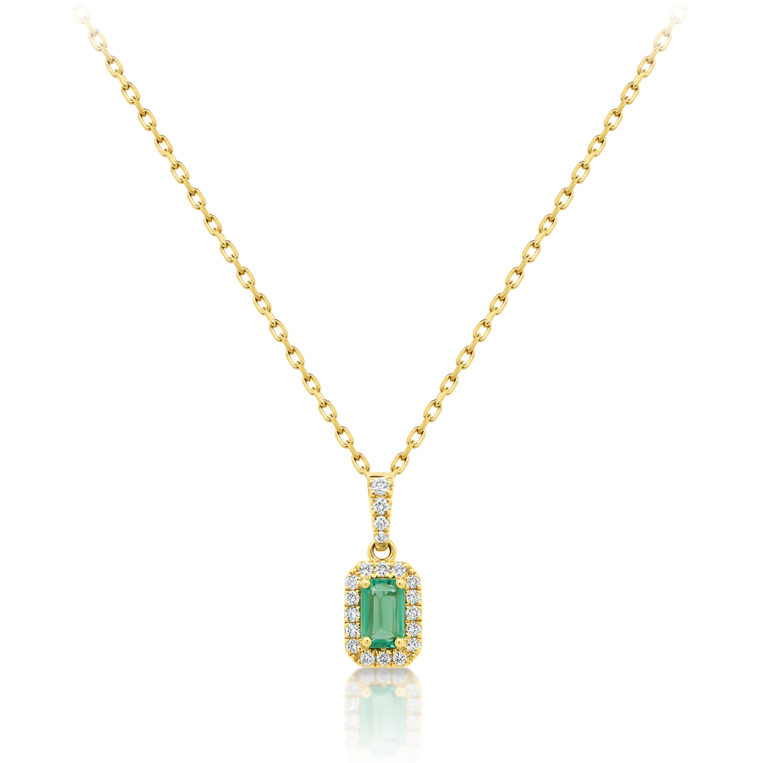 Lanț din aur galben de 18K și pandantiv încrustat cu un Smarald de 0.304ct și 20 de Diamante incolore Brilliant cut de 0.103ct.