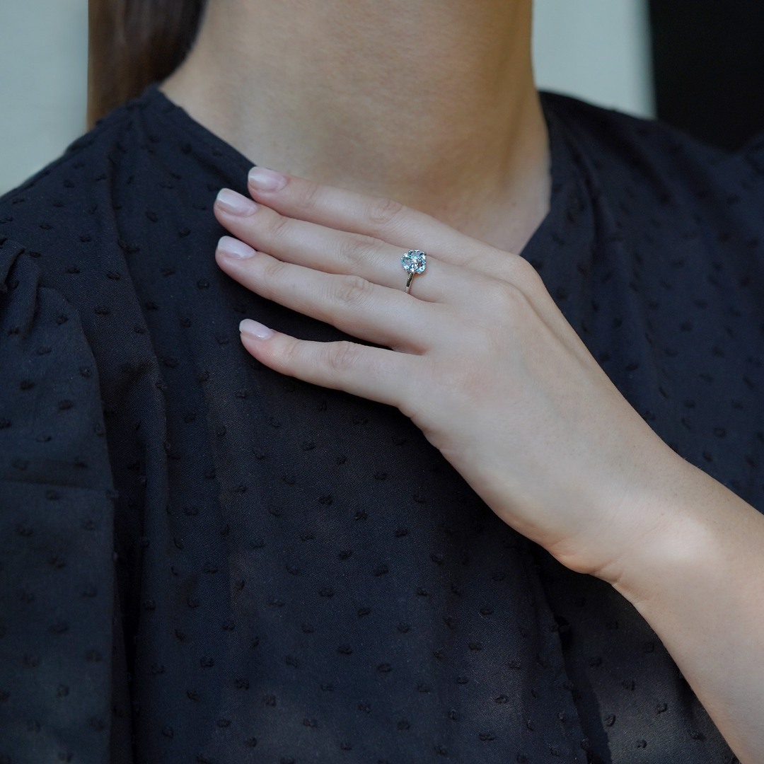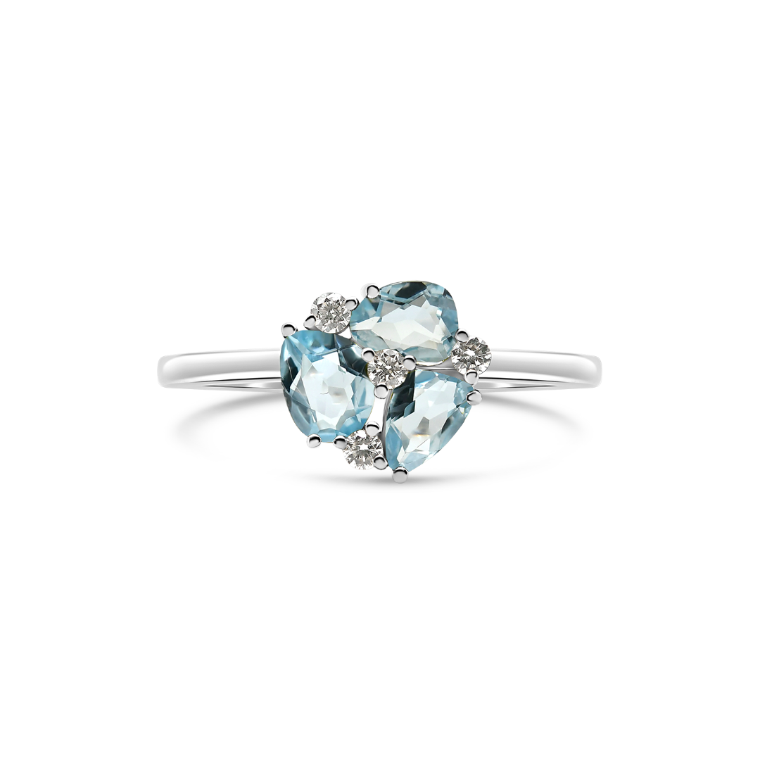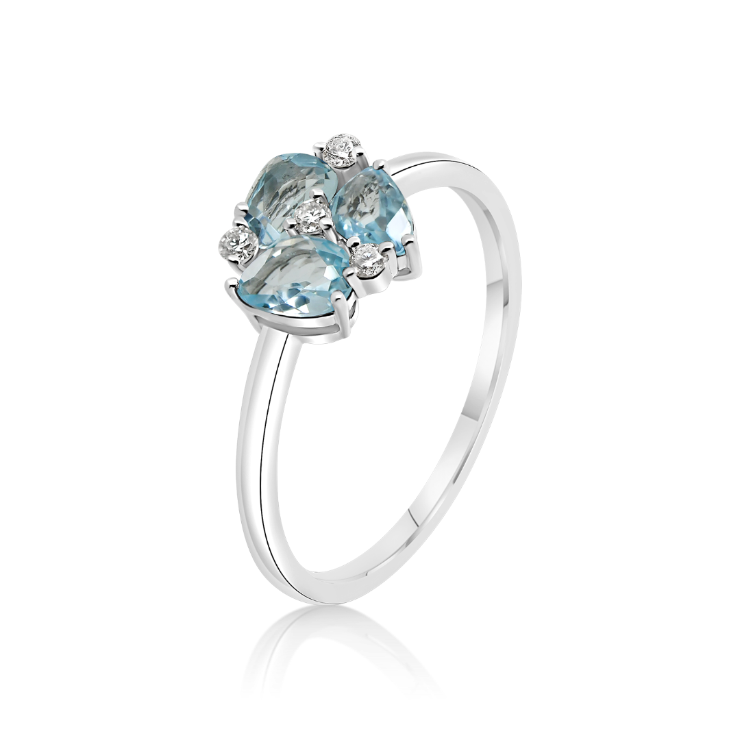Inel din aur alb de 18K cu 3 Blue Topaz și 4 Diamante naturale.