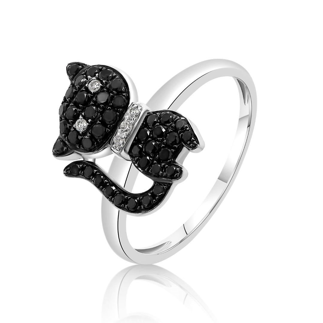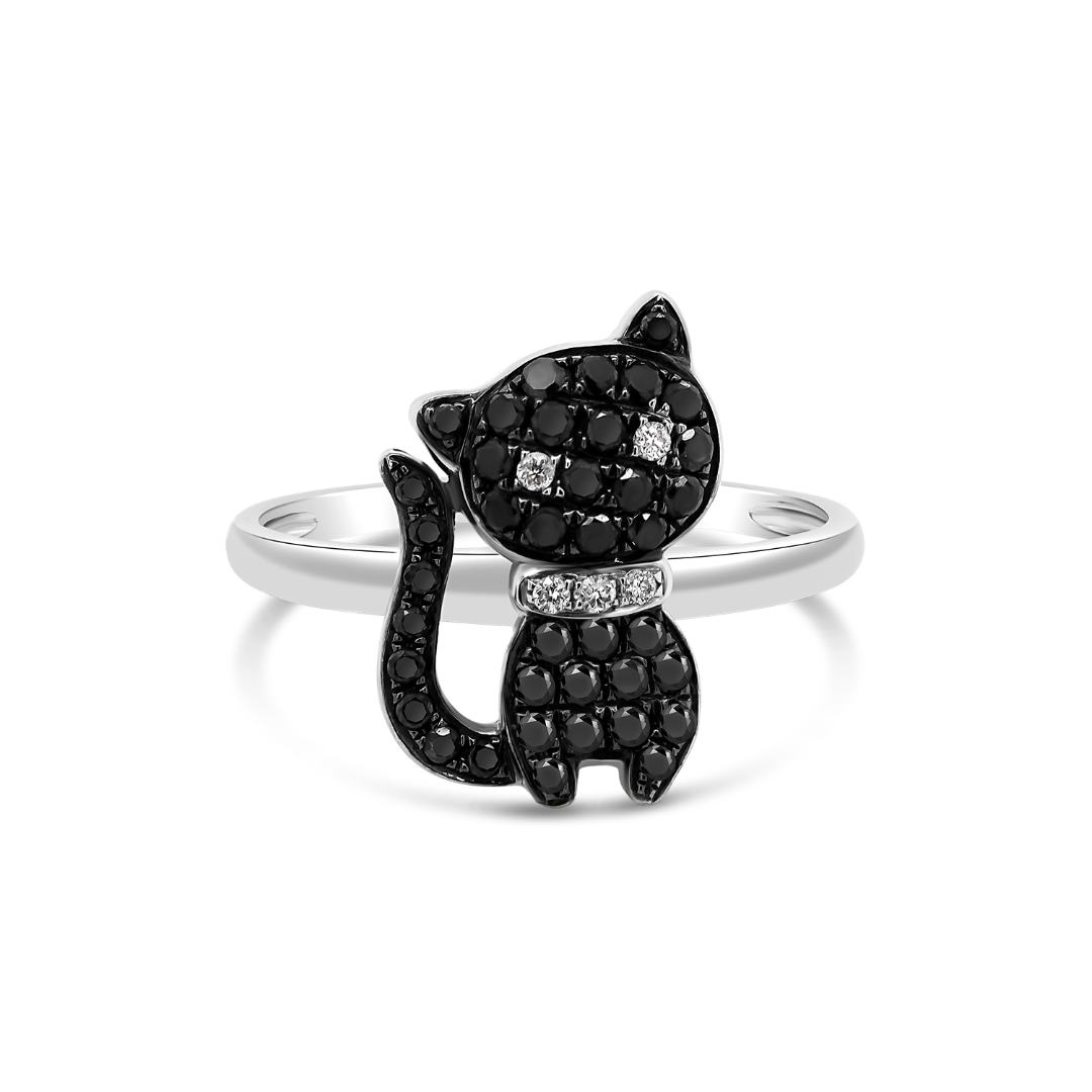 Inel din aur alb de 18K și element pisică cu Diamante naturale negre și incolore.