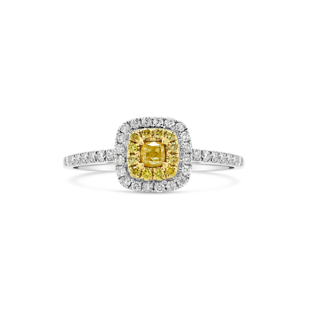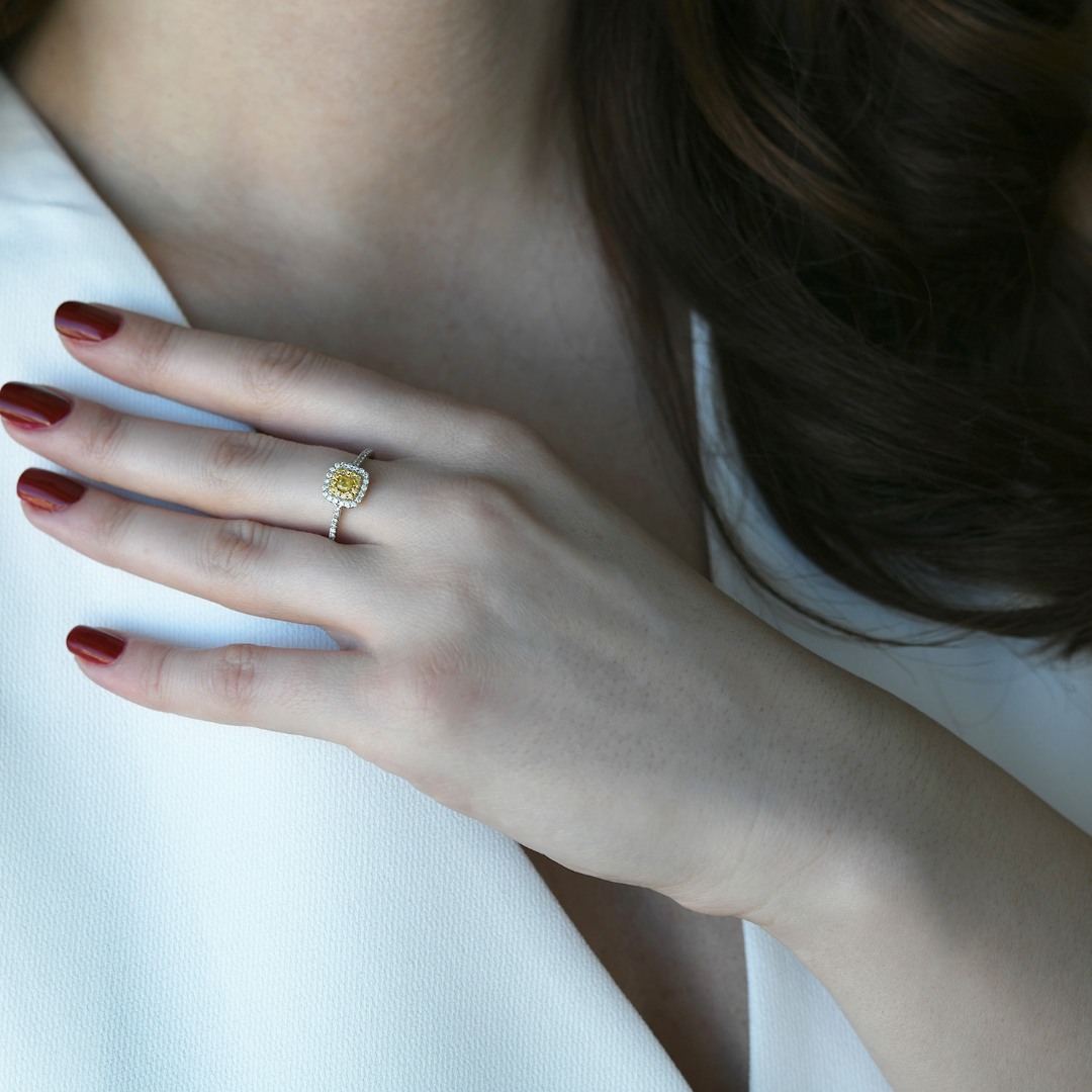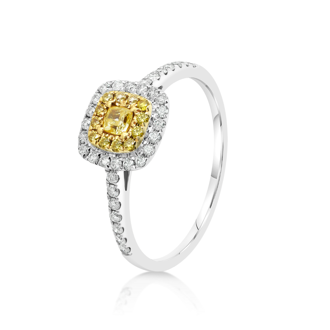 Inel din aur alb de 18K cu Diamante Fancy și incolore.