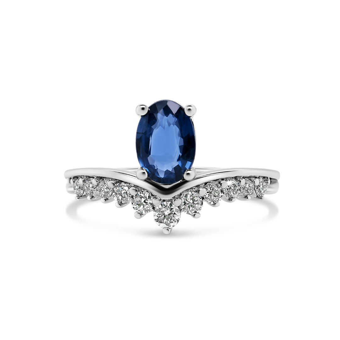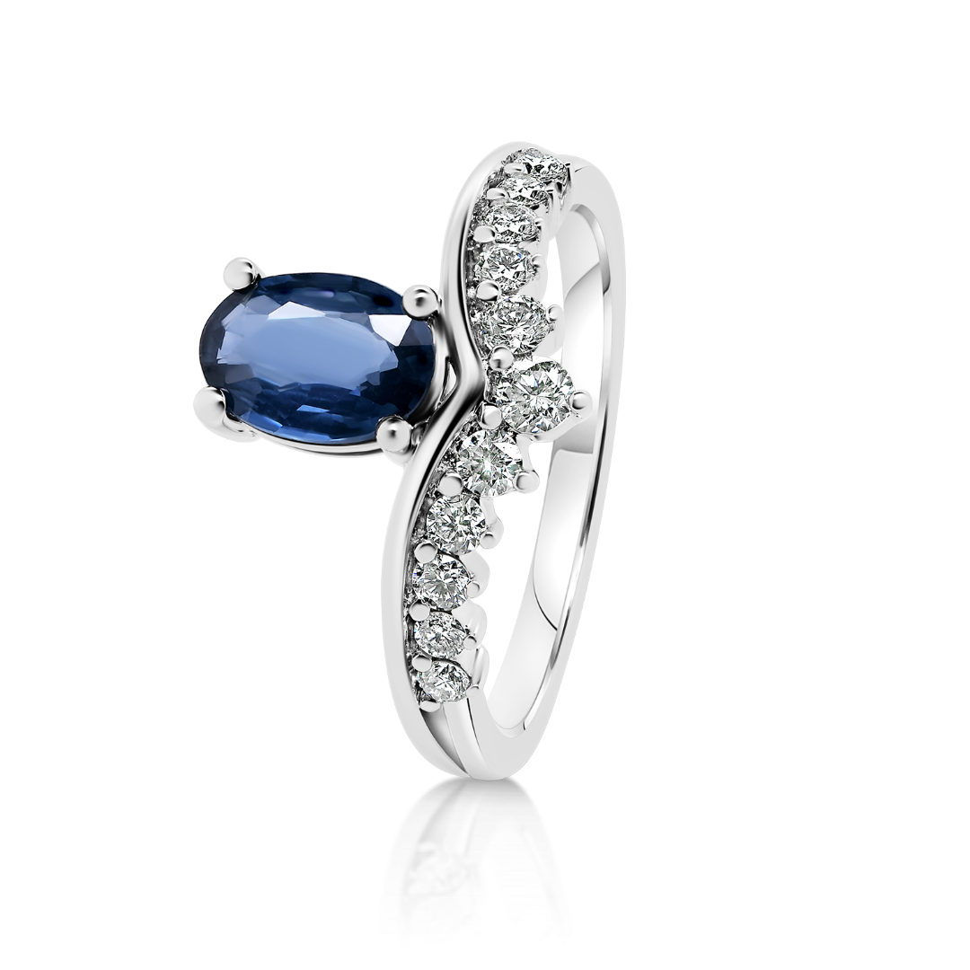 Inel din aur alb de 18K încrustat cu 11 Diamante naturale Round Brilliant de 0.25ct. și un Safir albastru de 0.85ct.