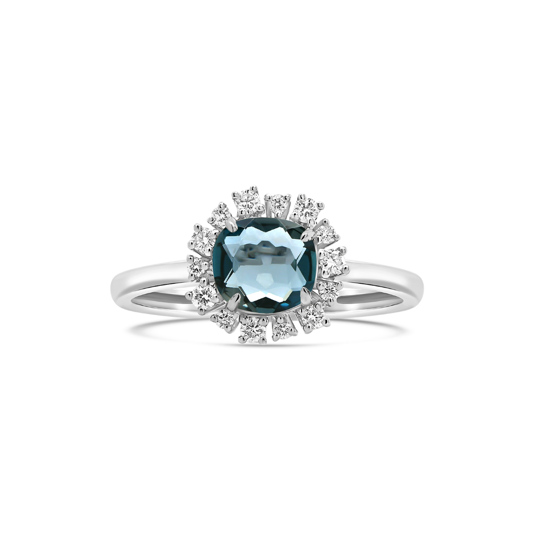 Inel din aur alb de 18K cu un London Blue Topaz și 10 Diamante Round Brilliant.