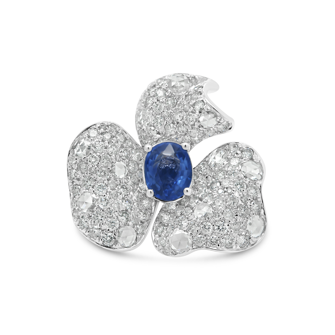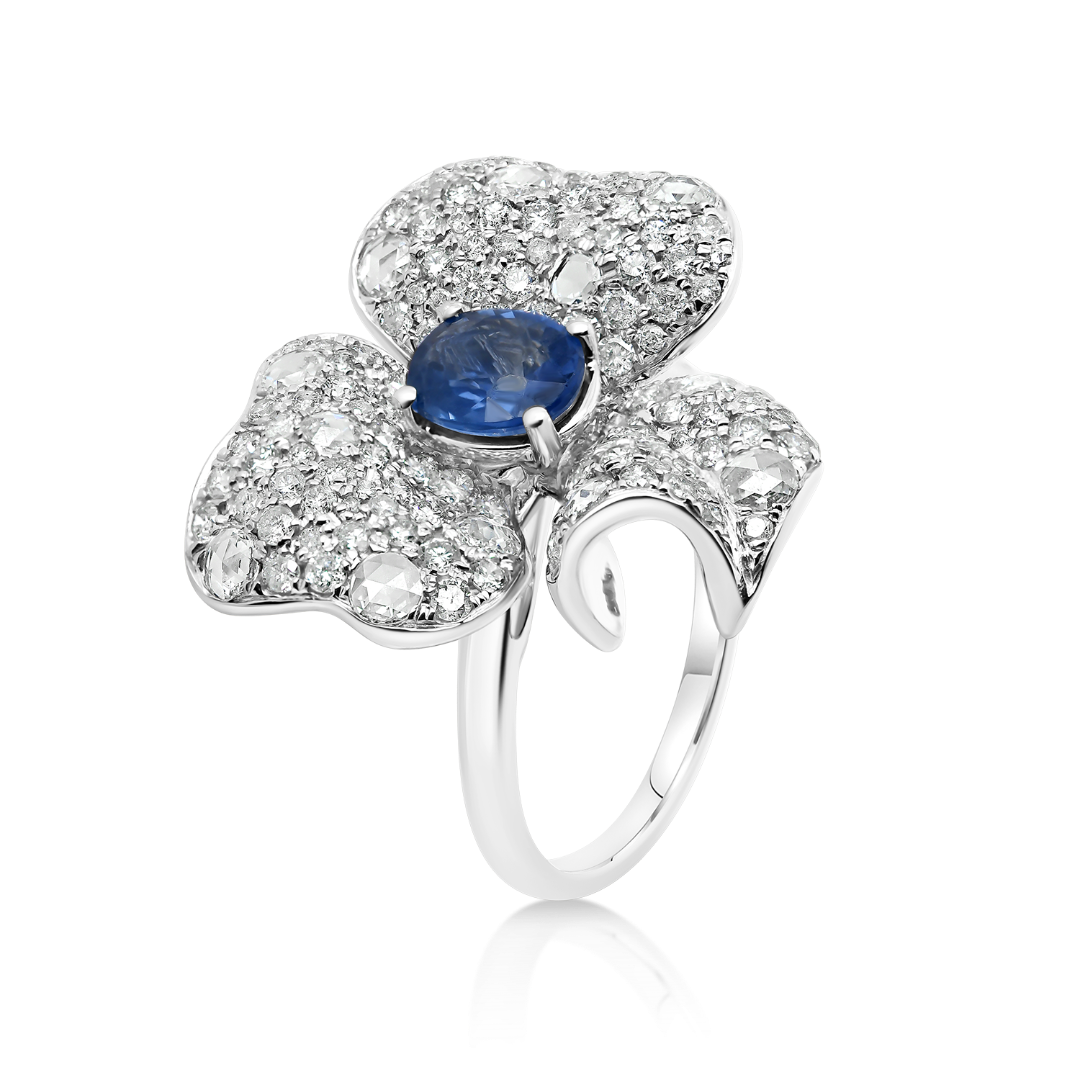 Inel din aur alb de 18K încrustat cu un Safir albastru de 1.03ct. și Diamante Brilliant cut de 1.80ct.