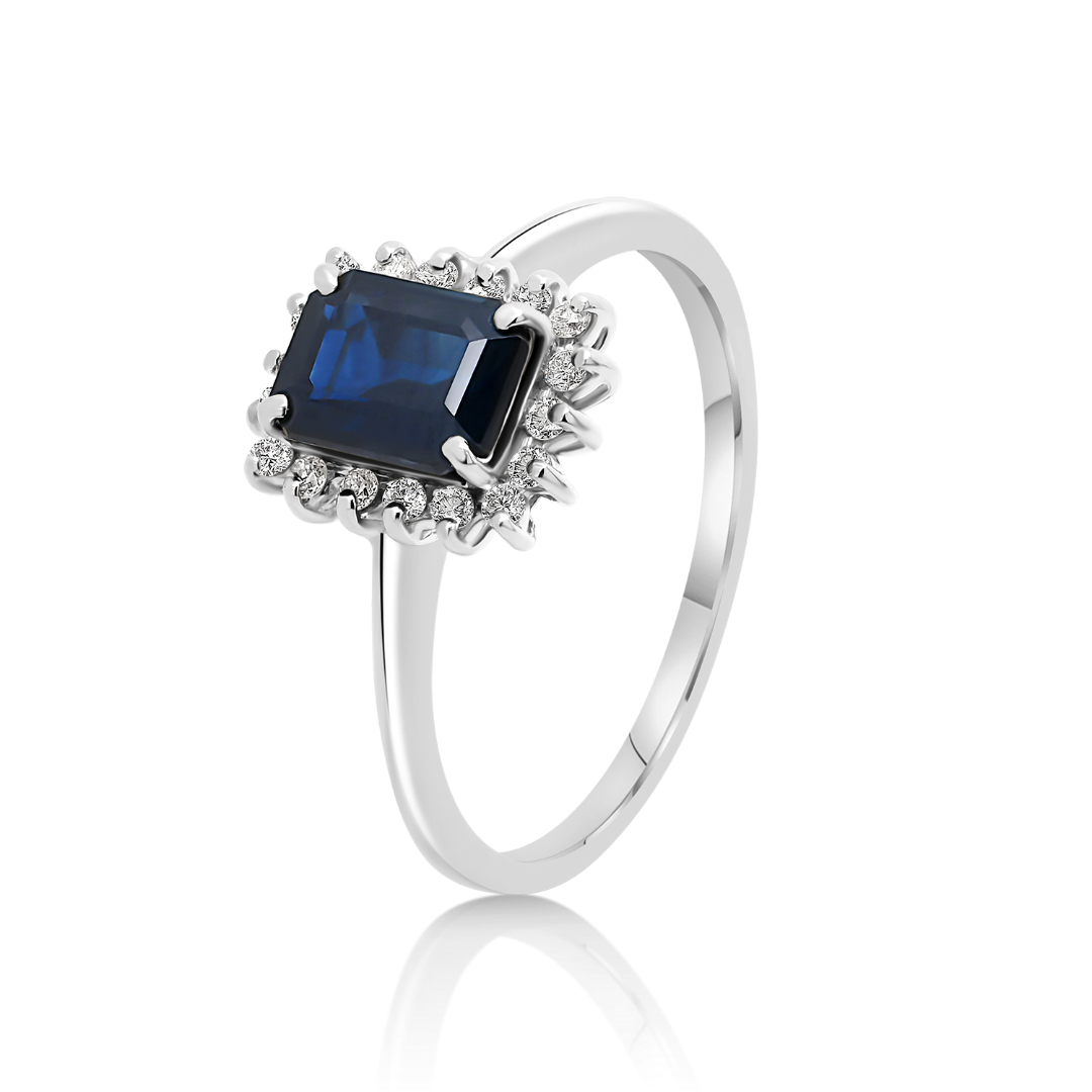 Inel din aur alb de 18K cu un Safir albastru și Diamante Round Brilliant.