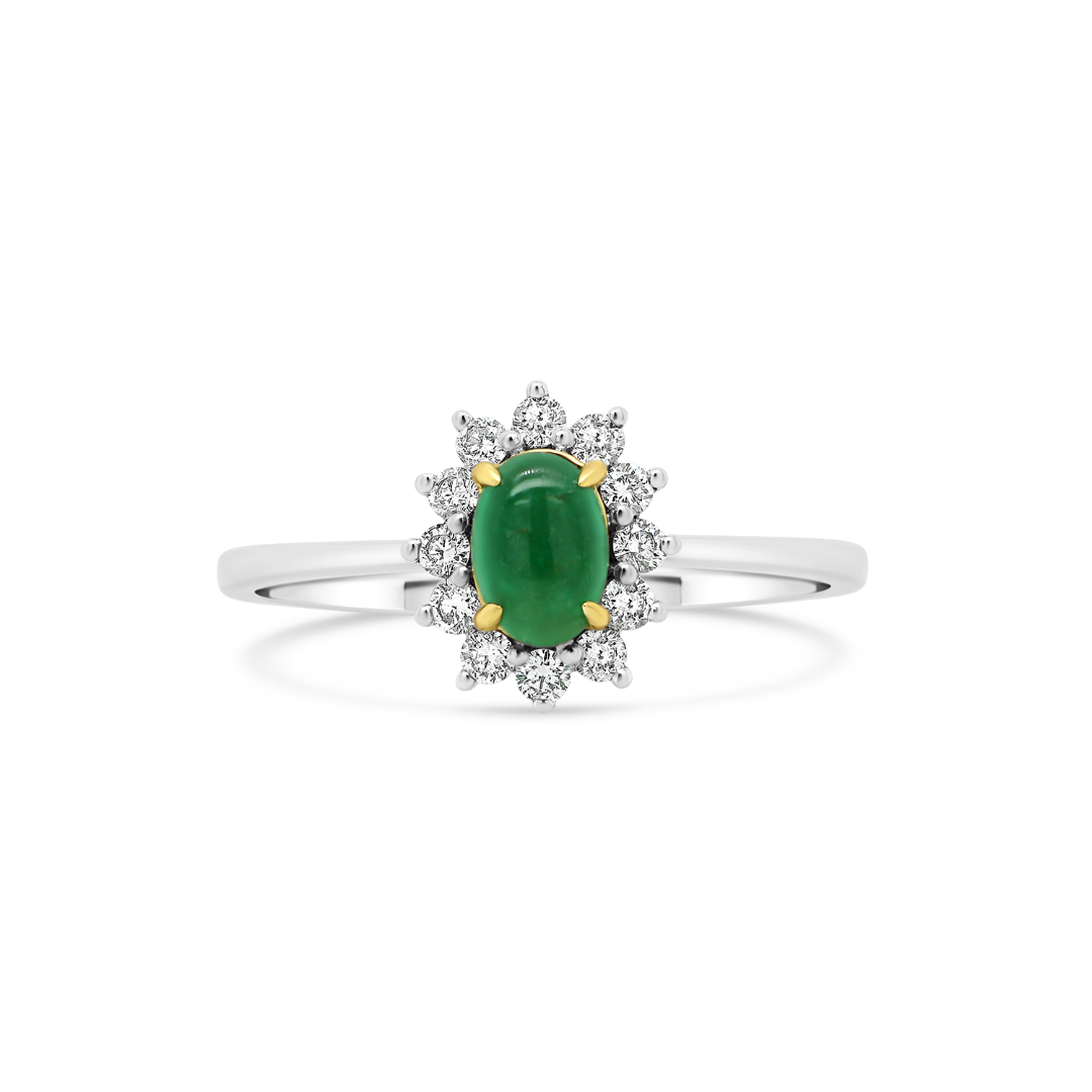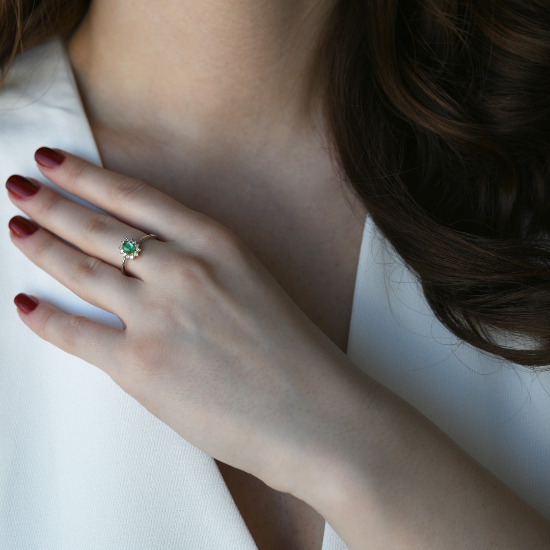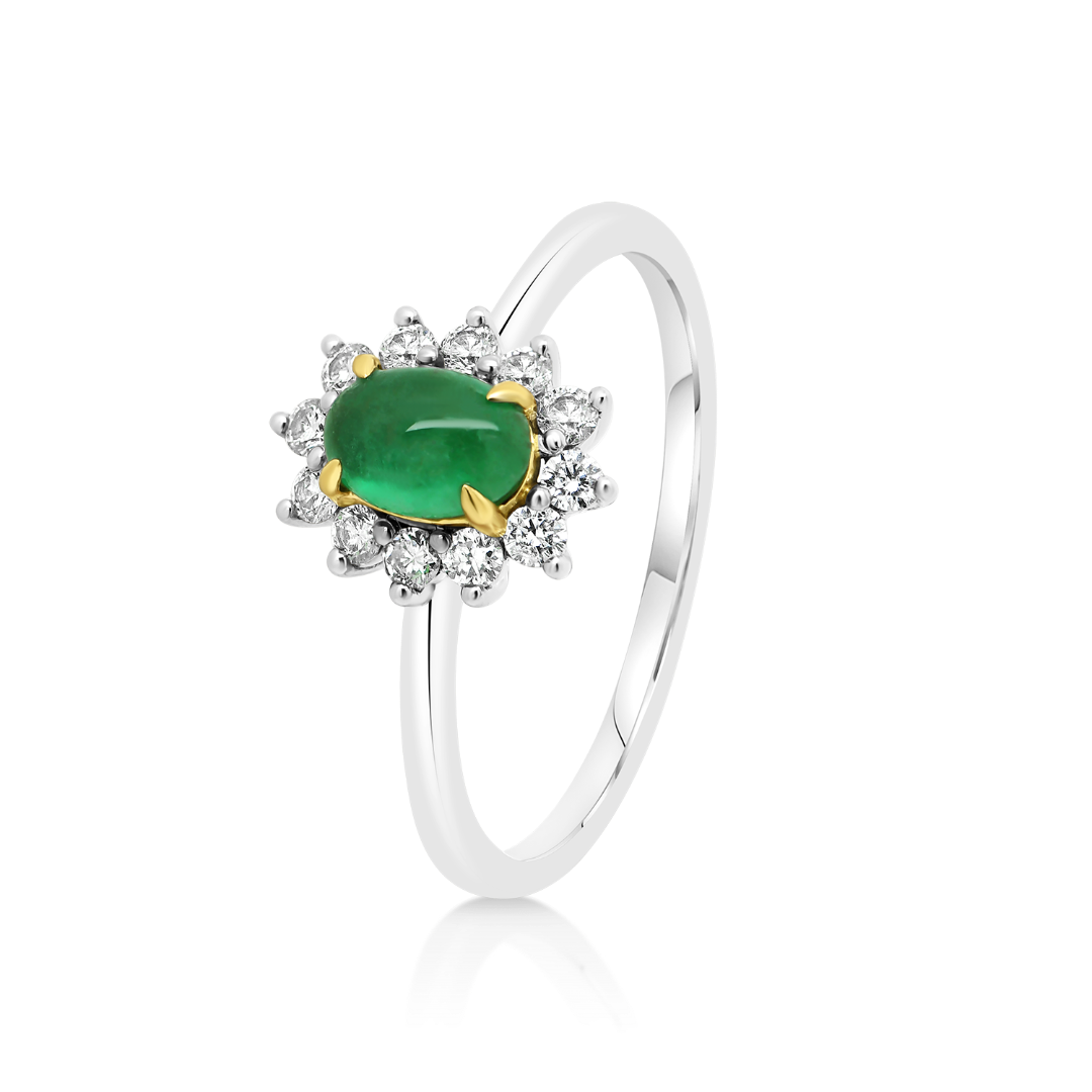 Inel din aur alb de 18K, încrustat cu un Smarald și 12 Diamante naturale Brilliant cut.