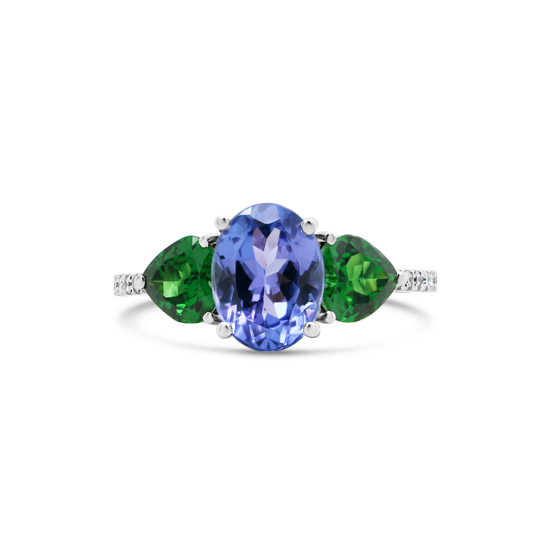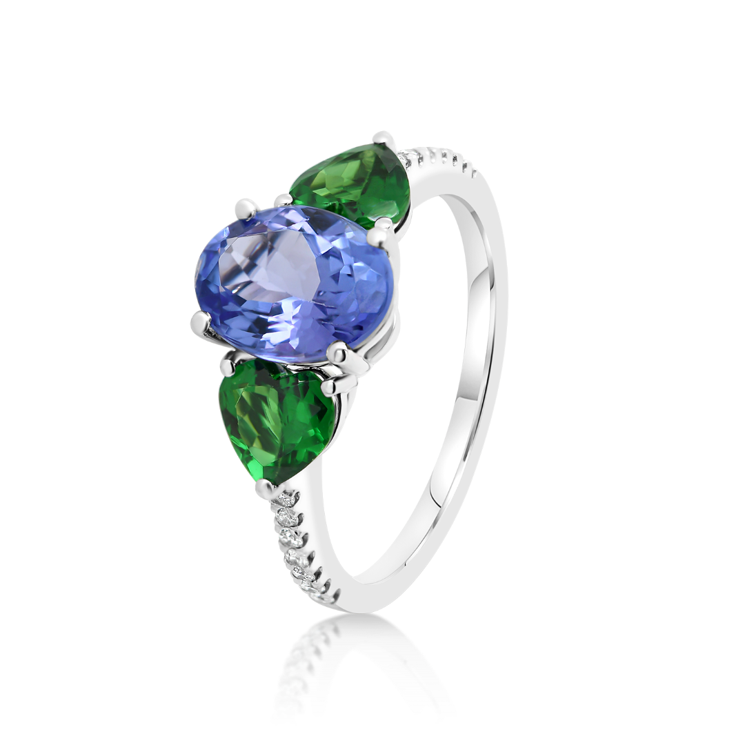 Inel din aur alb de 18K cu Tsavorit, Tanzanit și Diamante naturale Round Brilliant.