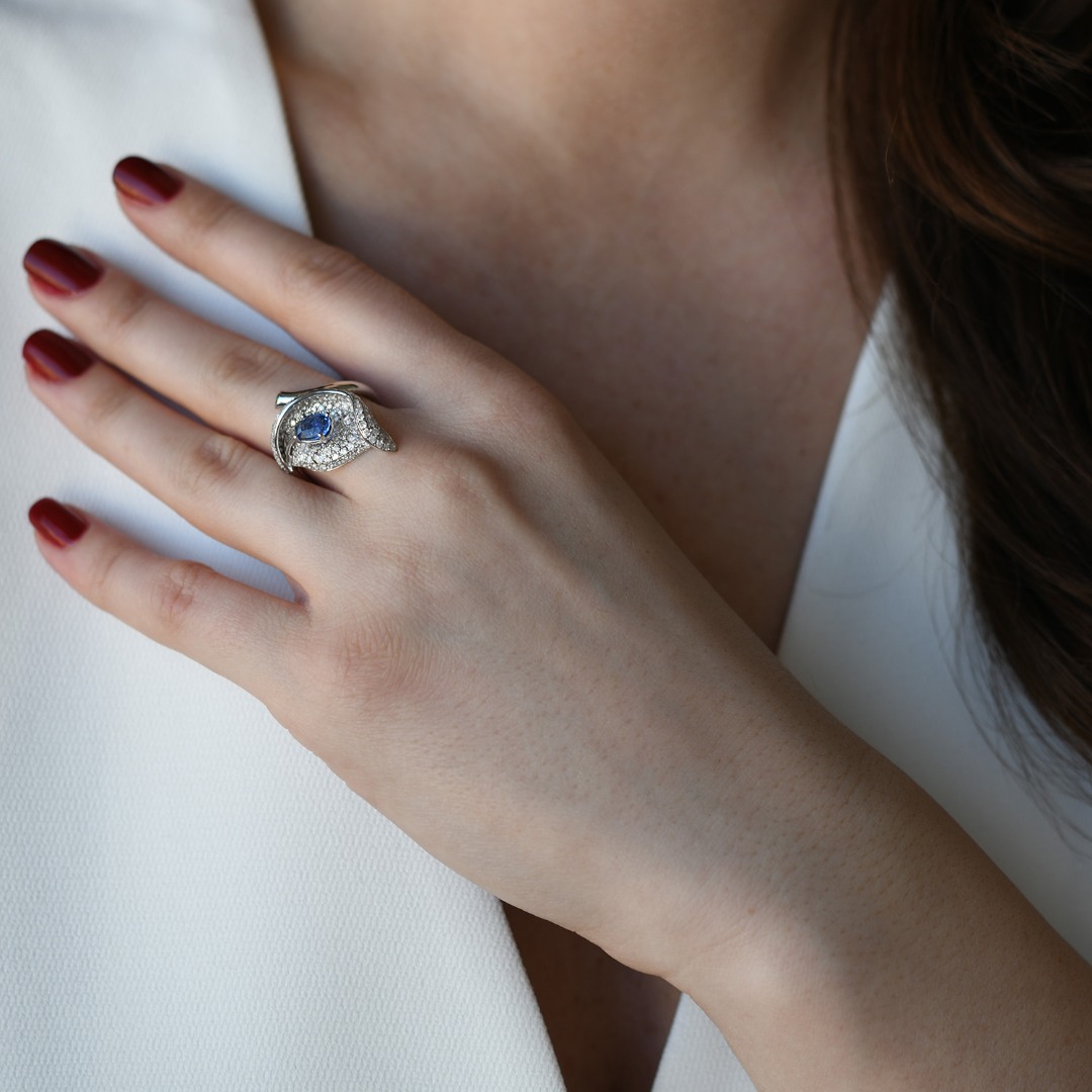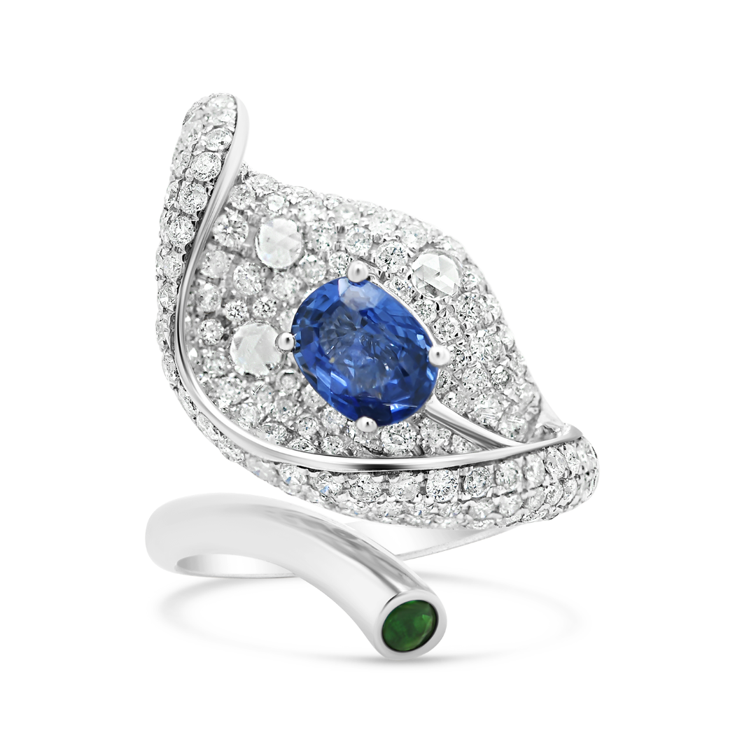 Inel din aur alb de 18K încrustat cu un Turmalin de 0.08ct, un Safir albastru de 1.02ct și Diamante Brilliant cut de 1.72ct.