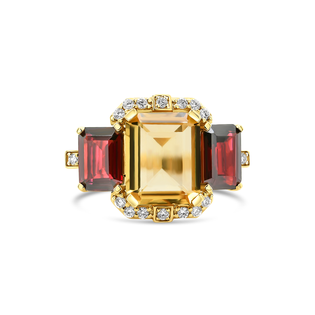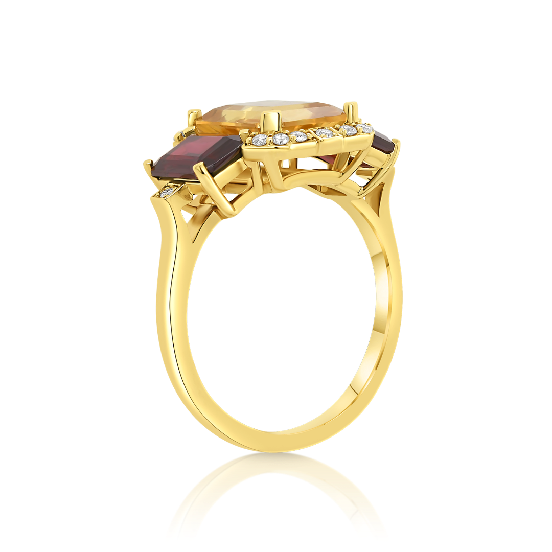 Inel din aur galben de 14K cu două Granate de 2.41ct, un Citrin central de 2.22ct și 16 Diamante brilliant cut cu un total de 0.13ct.