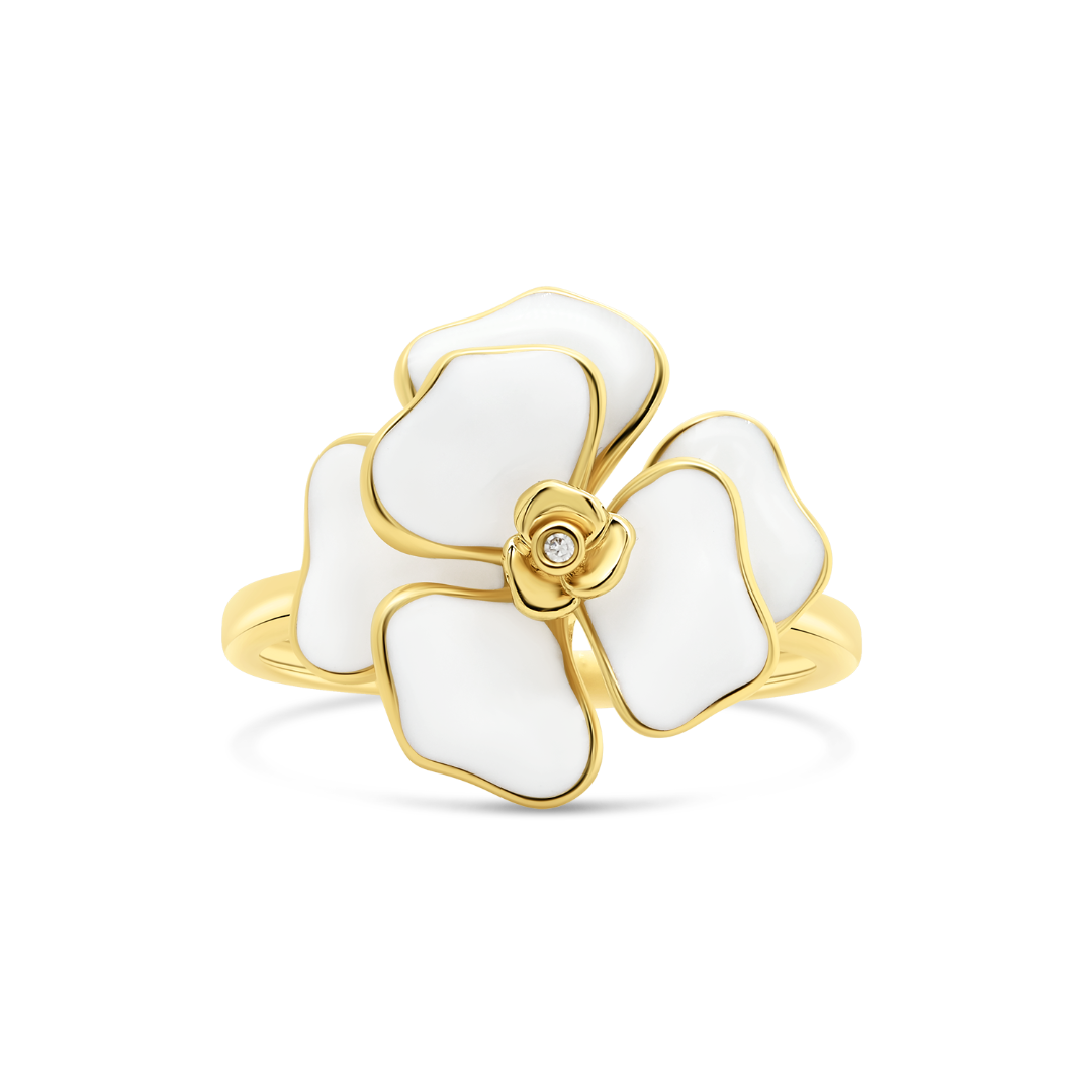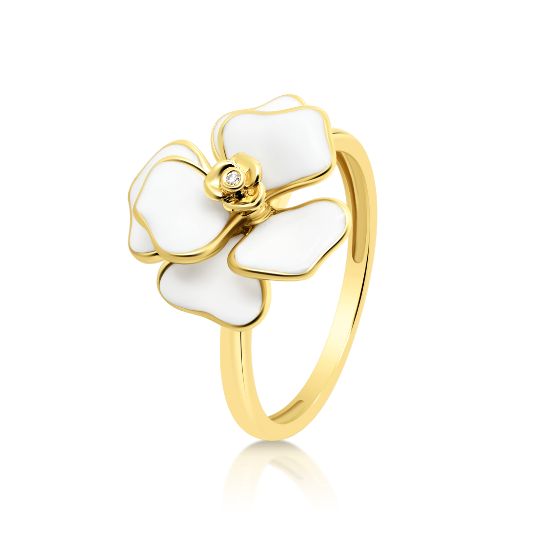 Inel din aur galben de 18K cu Email alb de 0.433ct și un Diamant Brilliant cut.