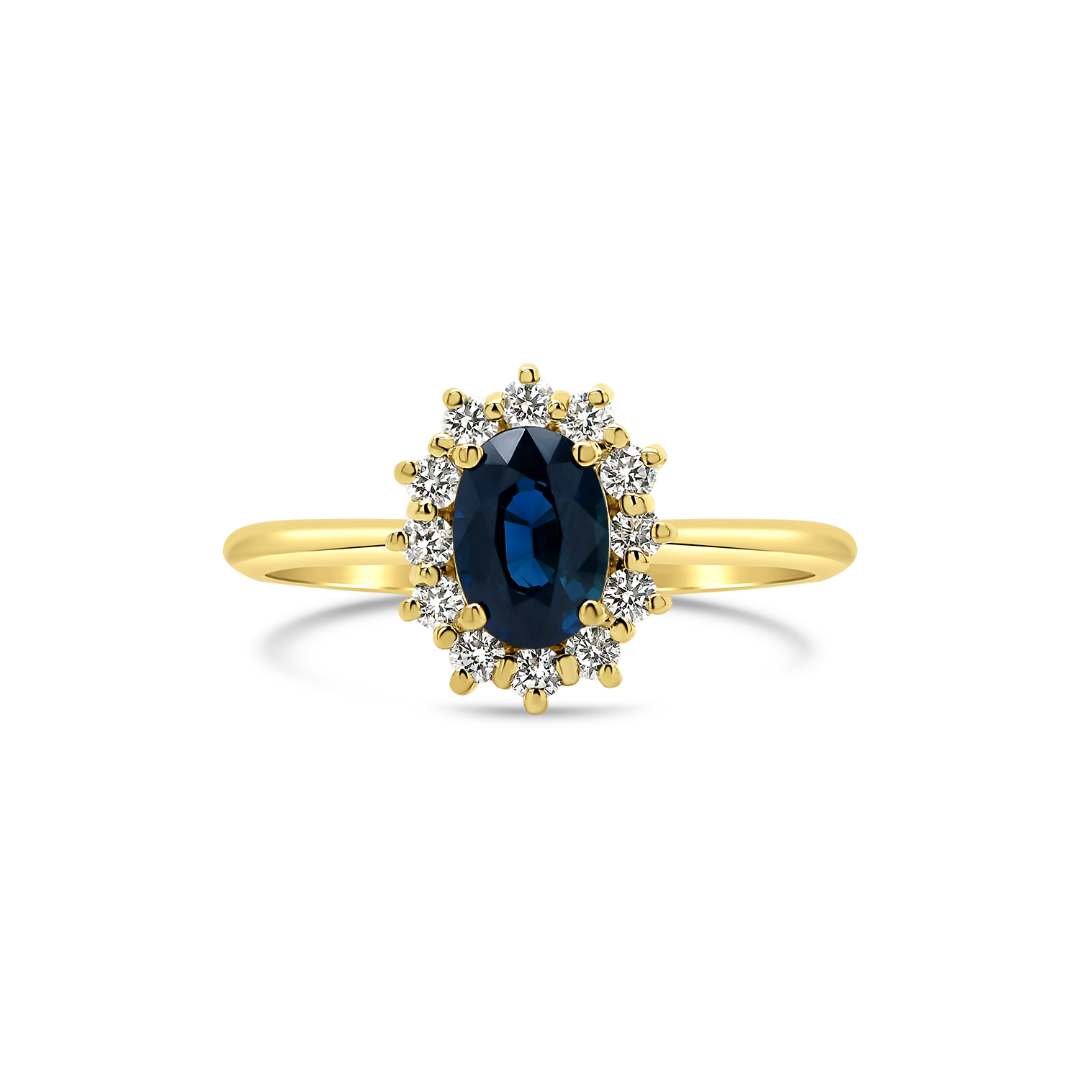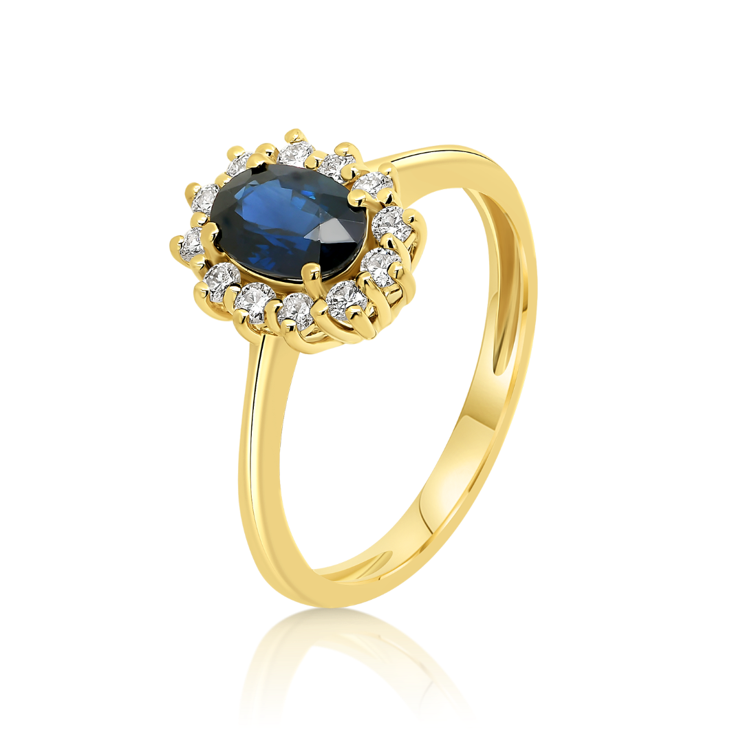 Inel din aur galben de 18K cu un Safir albastru de 0.94ct și Diamante Round Brilliant de 0.24ct.
