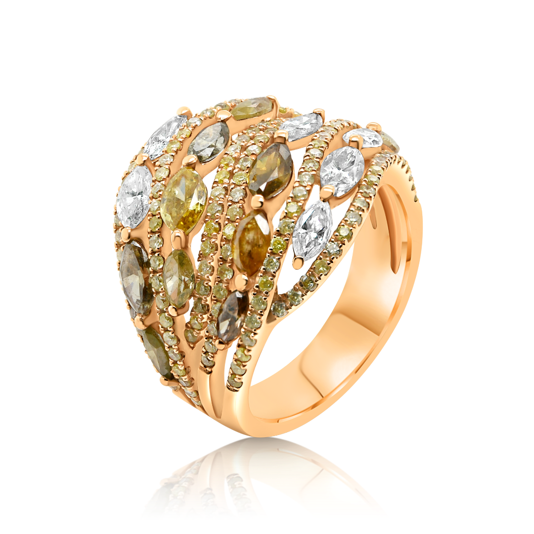 Inel din aur roz de 14K cu 6 Diamante incolore Marquise de 0.70ct, 10 Diamante Fancy Marquise de 1.37ct și 134 de Diamante Fancy Round Brilliant de 0.73ct.