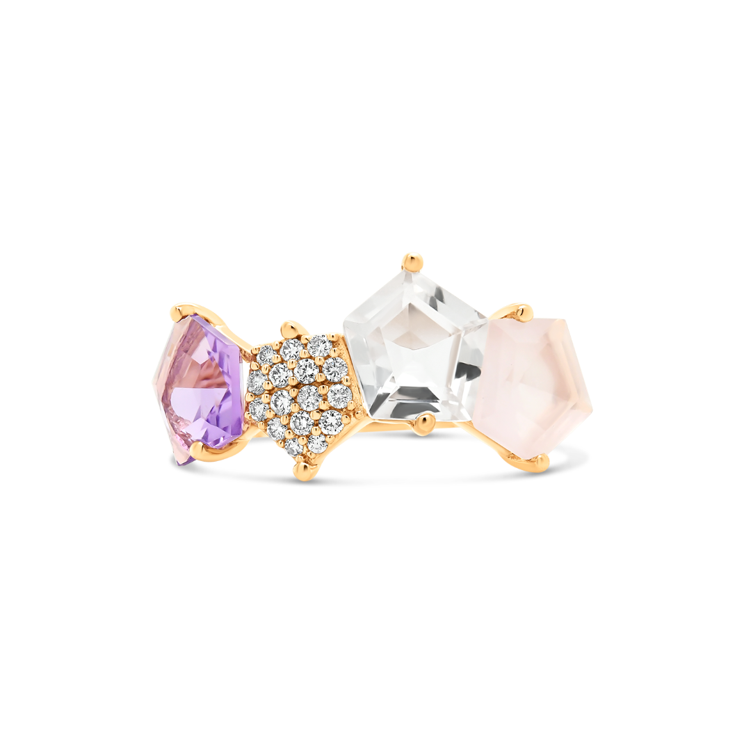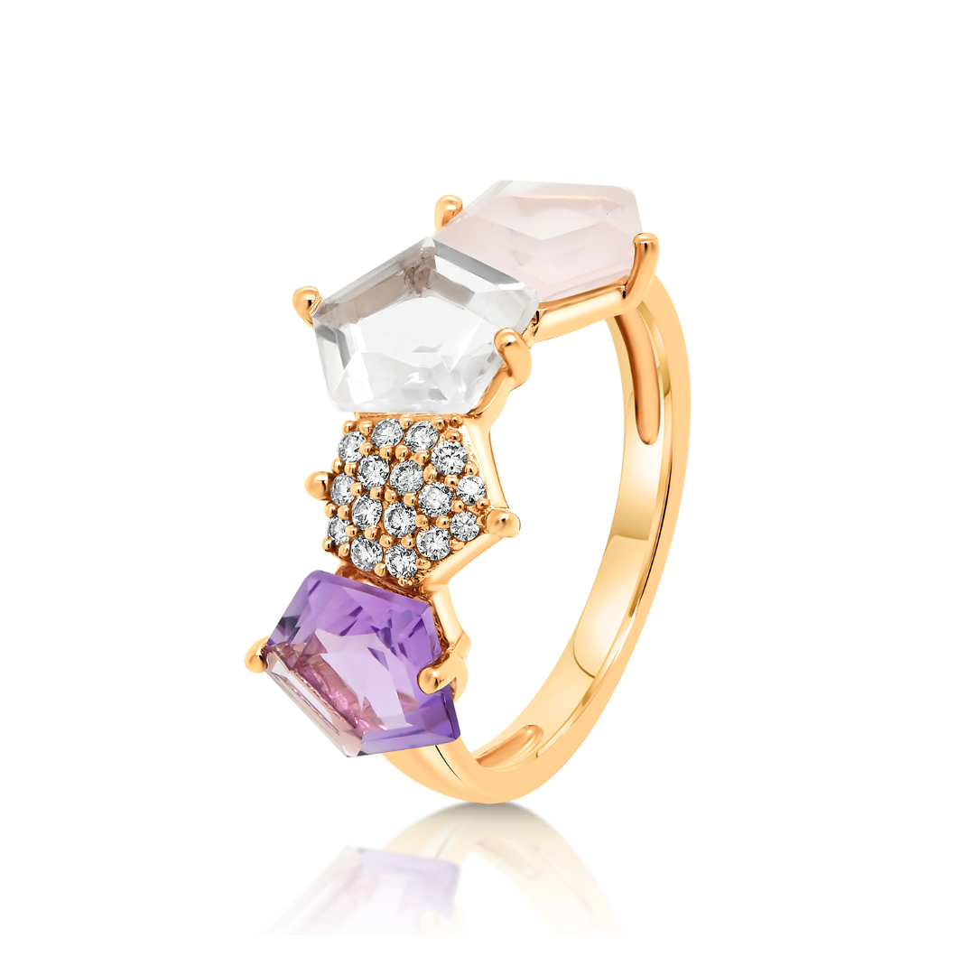 Inel din aur roz de 18K încrustat cu un Ametist de 0.965ct, un Quartz alb de 1.095ct, un Quartz roz de 0.975ct și 16 Diamante Brilliant cut de 0.109ct.