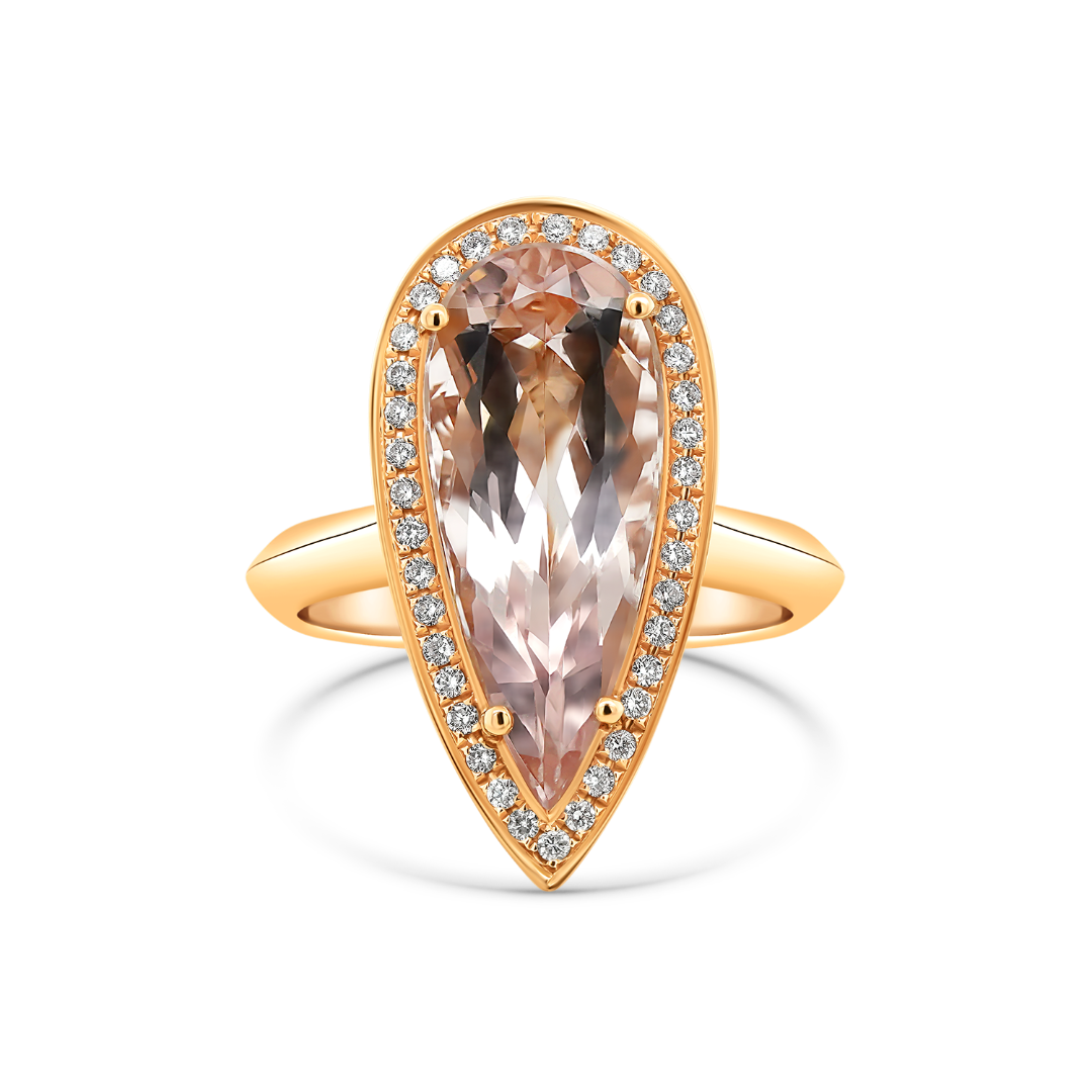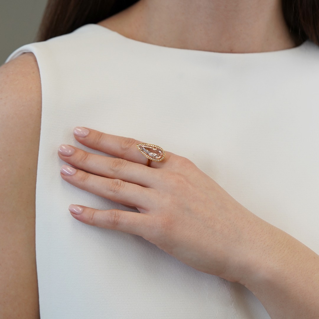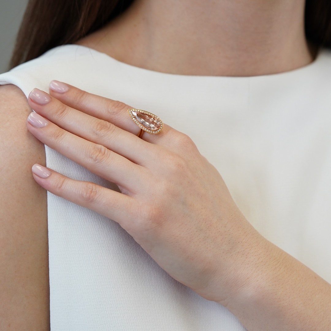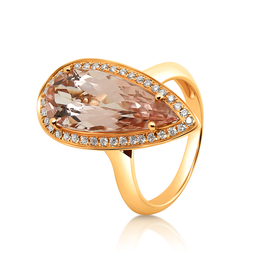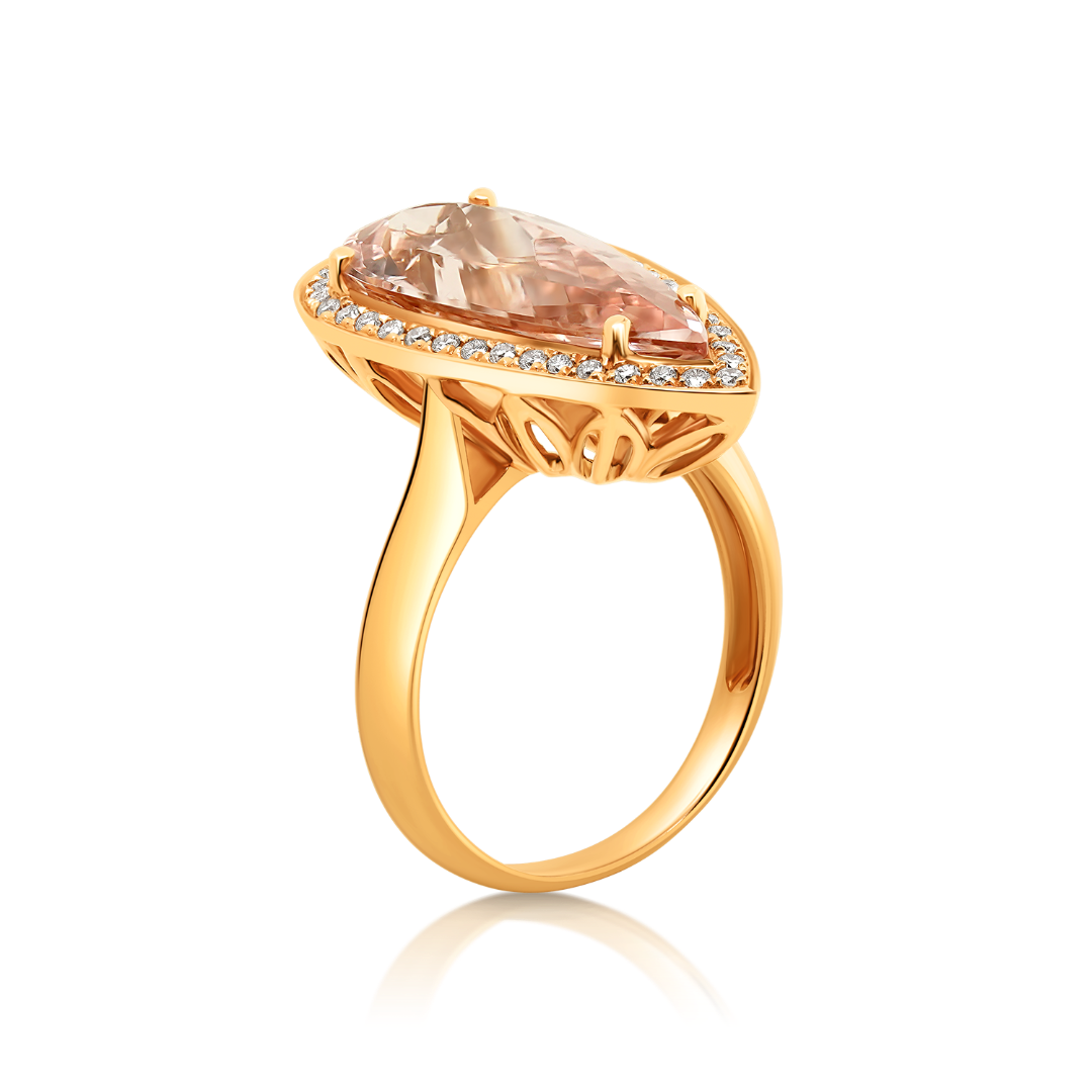 Inel realizat din aur roz de 18K, cu un Morganit de 5.04ct cu nuanțe delicate de roz. Piatra este pusă în valoare de diamante brilliant cut cu o greutate totală de 0.24ct, ce adaugă strălucire și rafinament designului. O bijuterie feminină și sofisticată, ideală pentru ocazii speciale.