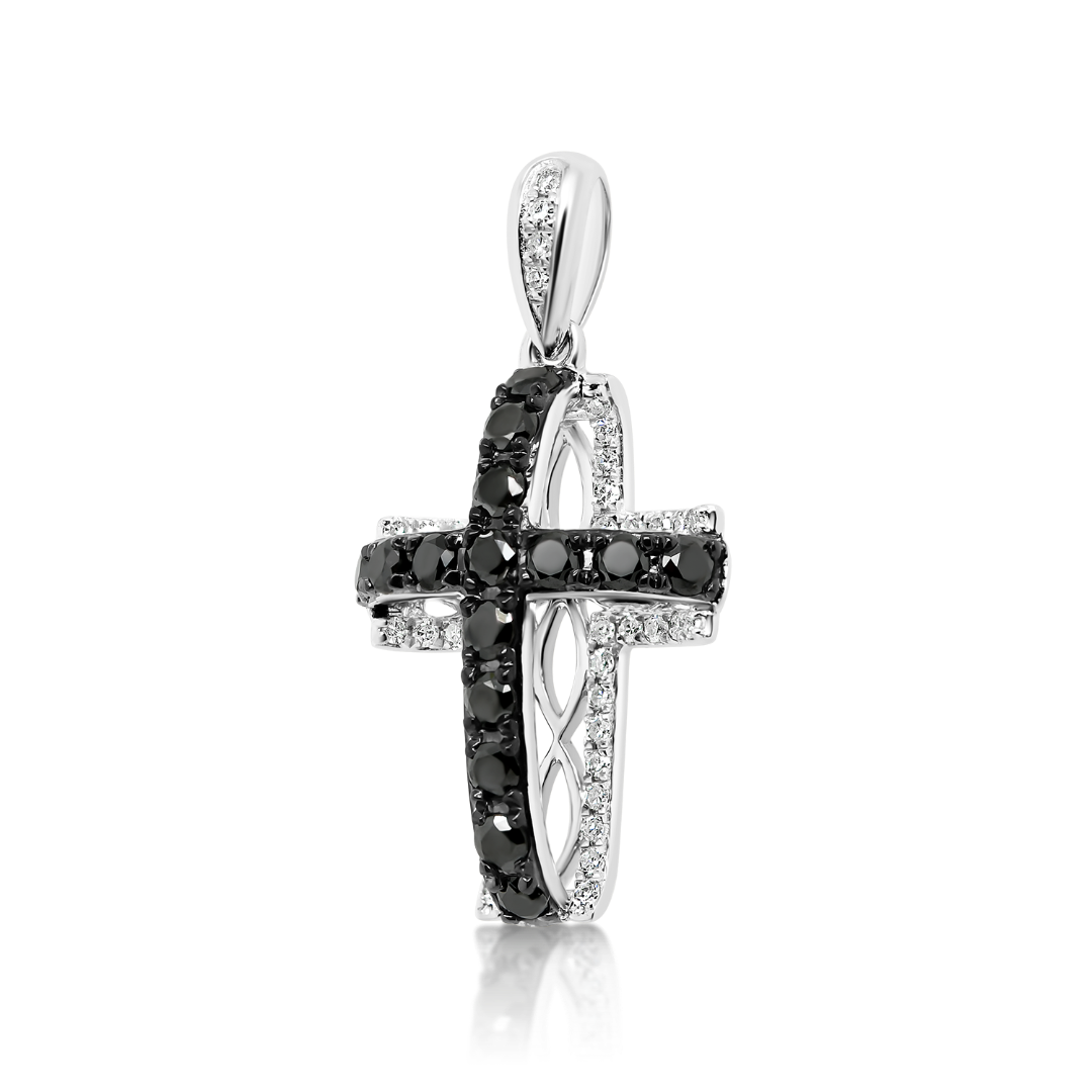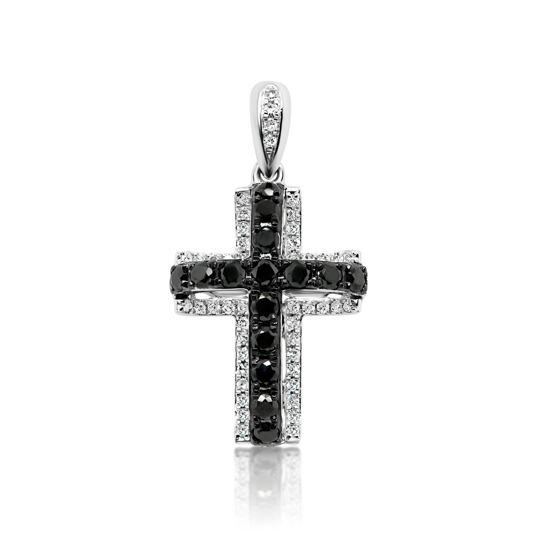 Pandantiv cruce din aur alb de 18K, încrustat cu Diamante negre și Diamante incolore, naturale.