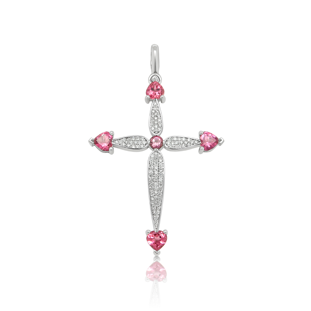 Pandantiv cruce din aur alb de 18K cu Rubine și Diamante naturale.