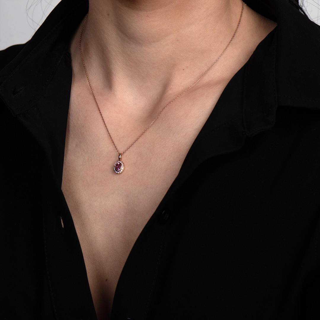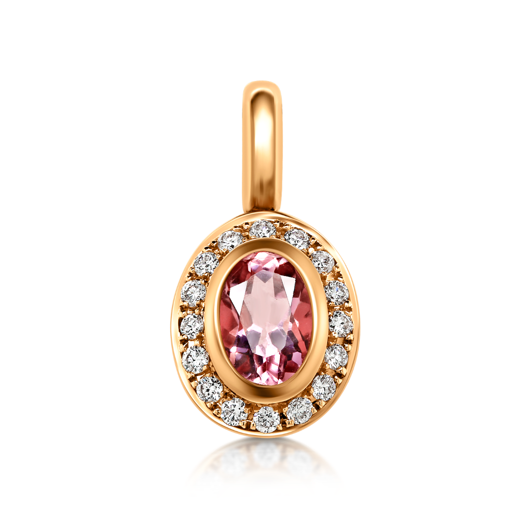 Pandantiv din aur roz de 18K, cu 18 Diamante de 0.08ct. și Turmalin Roz de 0.43ct.