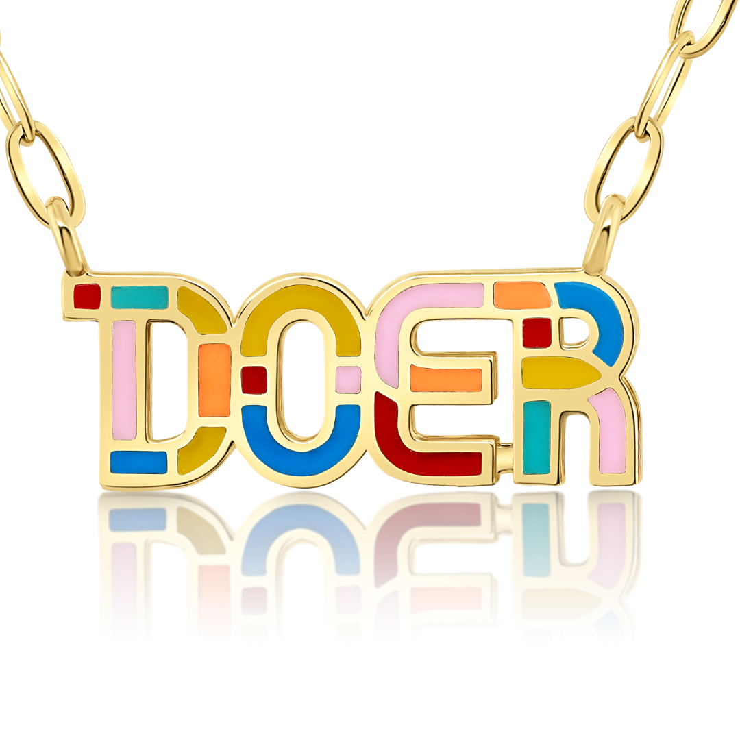 Lanț din aur galben de 14K și pandantiv "DOER" cu Email colorat.