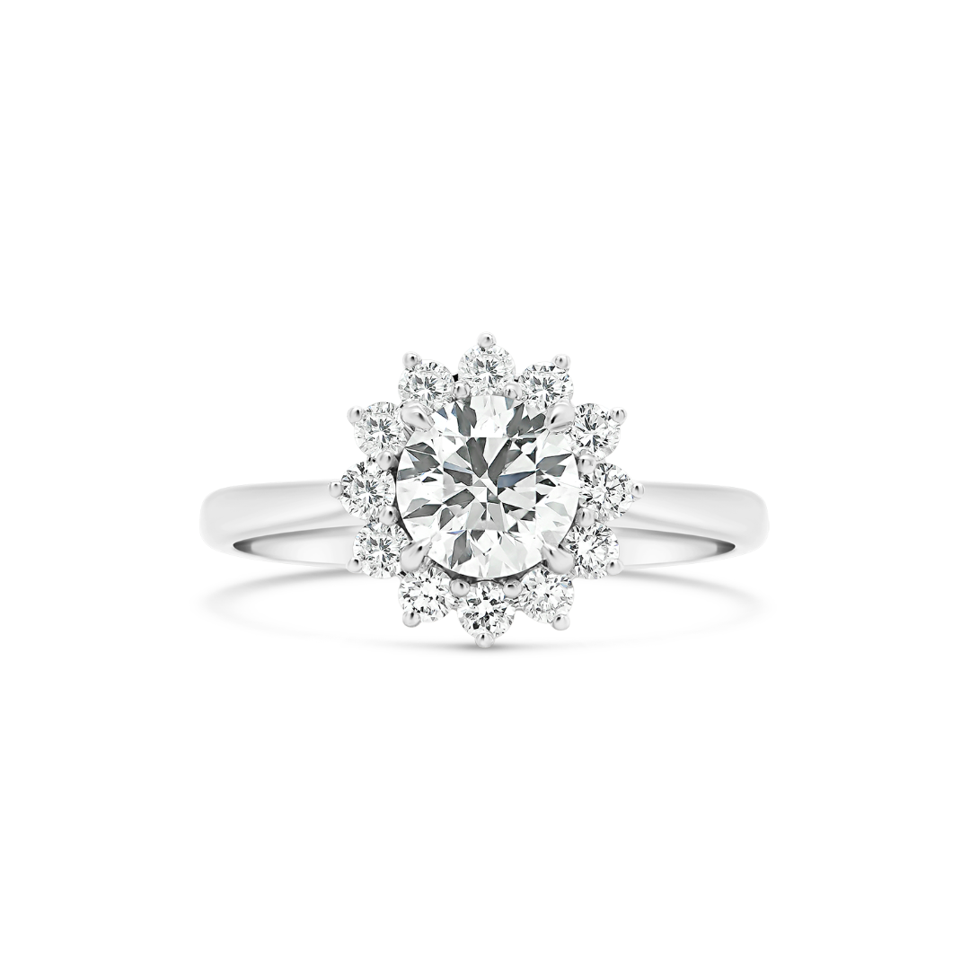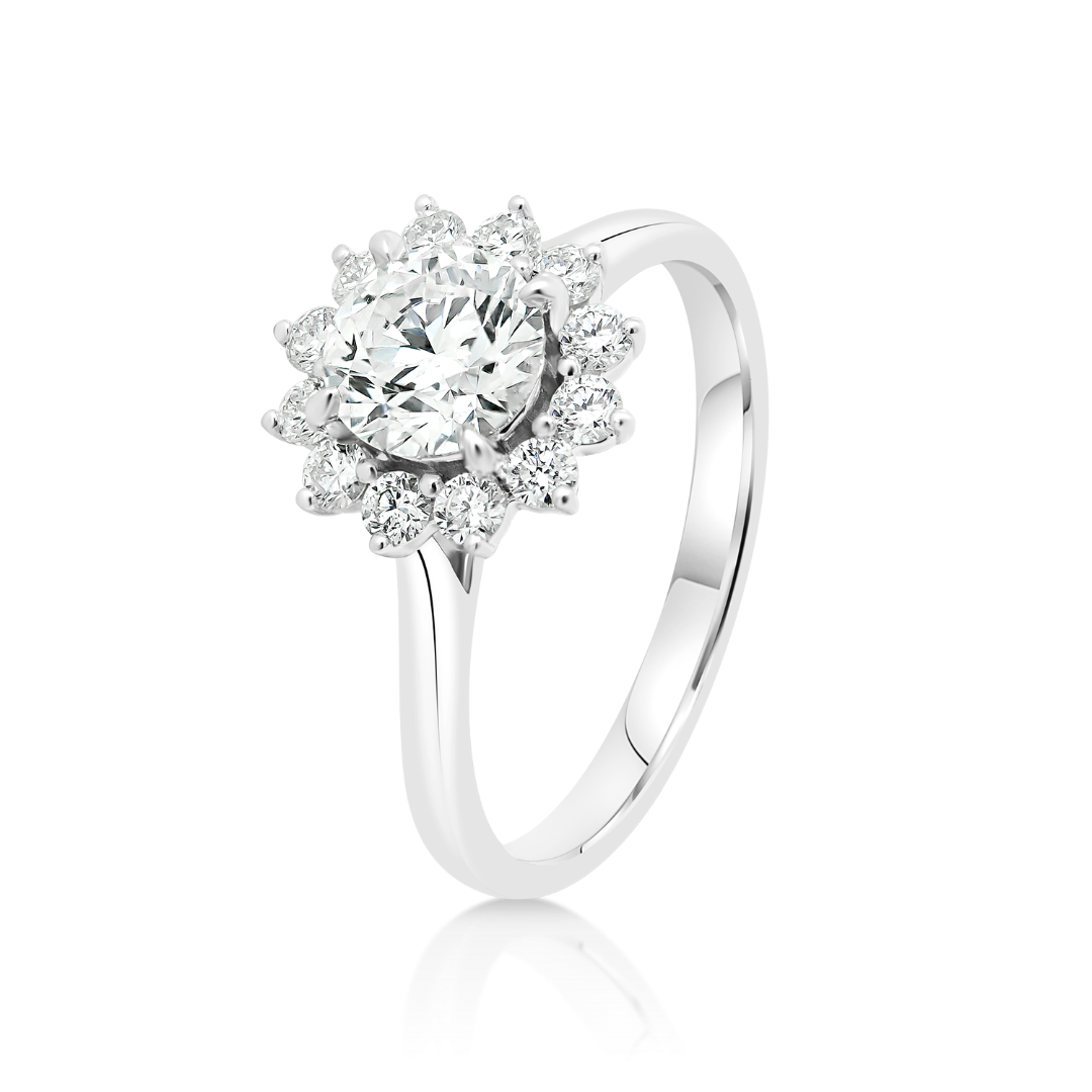 Inel de logodnă din aur alb de 18K, încrustat central cu un Diamant Brilliant de 0.71ct. certificat la prestigiosul Institut Gemologic GIA cu numărul 1399409253 și lateral cu 12 Diamante de 0.278ct.