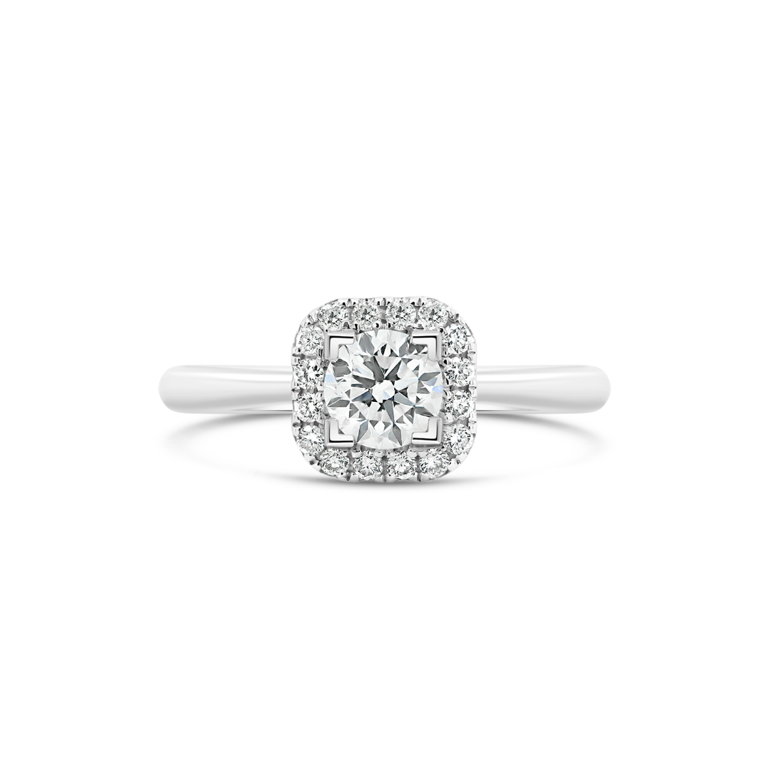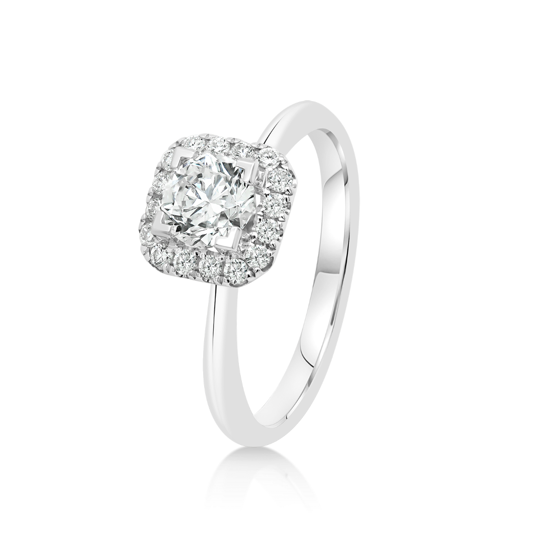 Inel de logodnă din aur alb de 18K, încrustat central cu un Diamant Brilliant de 0.50ct certificat la prestigiosul Institut Gemologic GIA cu numărul 6432956416 și lateral cu 16 Diamante de 0.146ct.