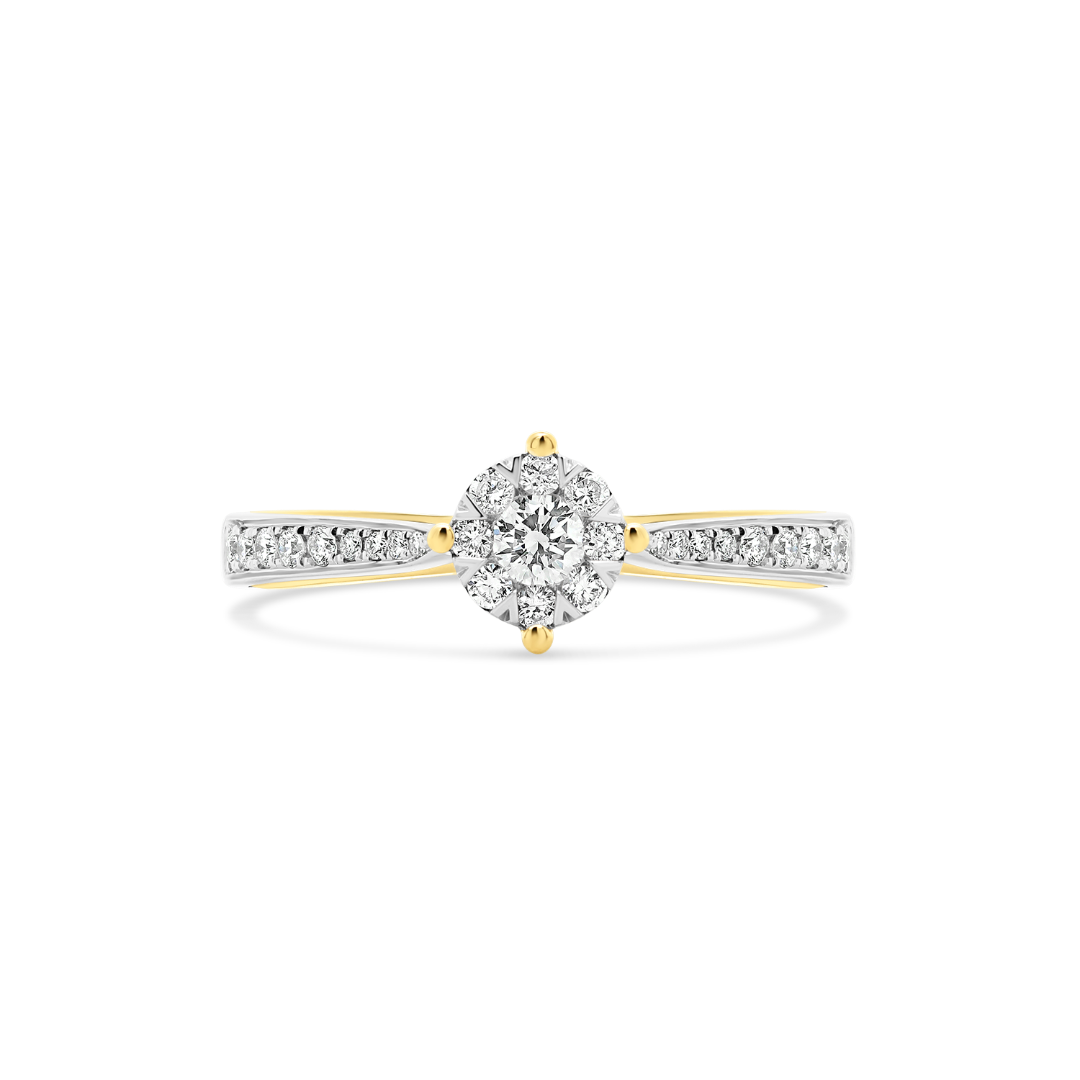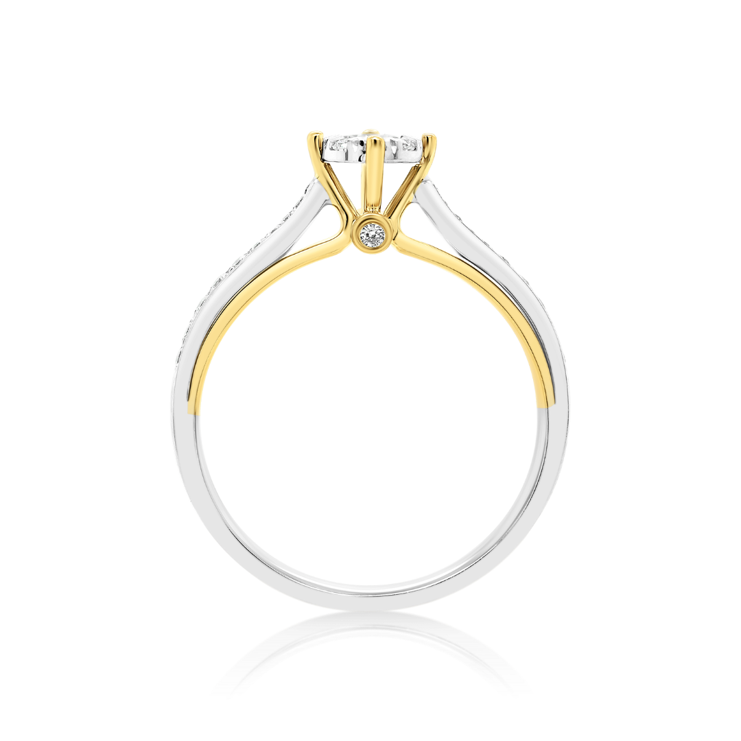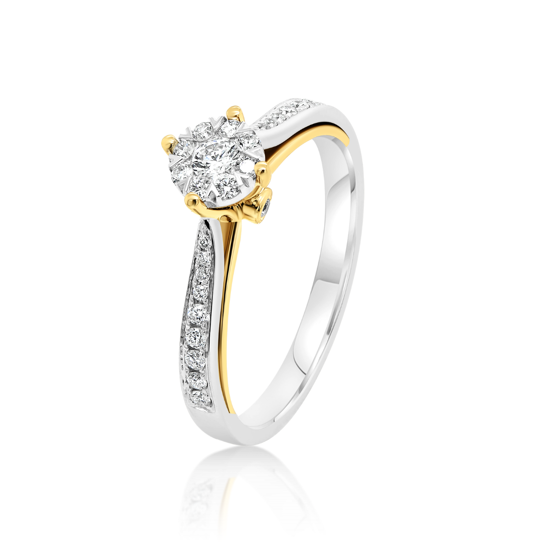 Inel de logodnă din aur alb de 18K, încrustat cu 29 de Diamante naturale Round Brilliant și element din aur galben.