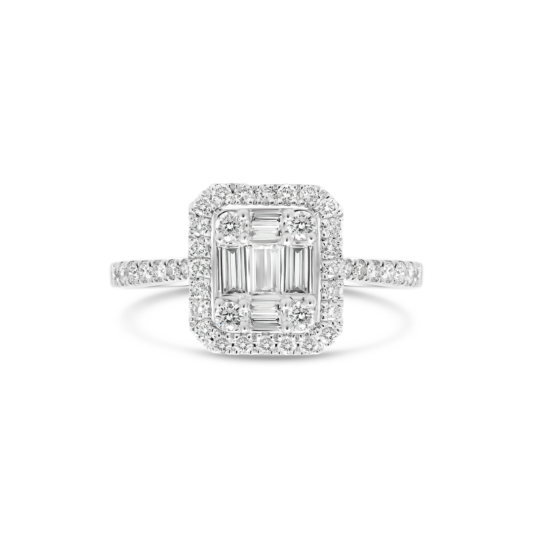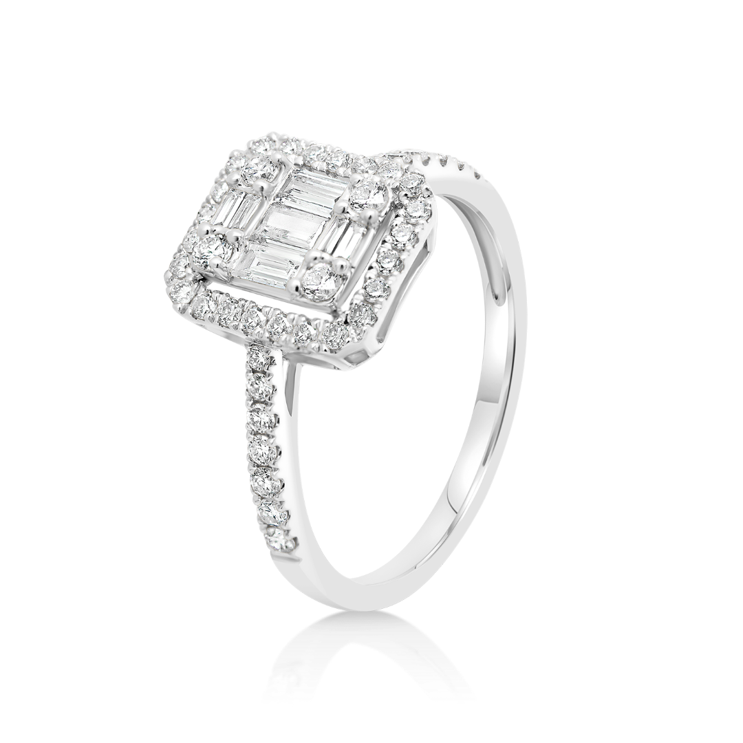 Inel de logodnă din aur alb de 18K, încrustat cu 7 Diamante Baguette de 0.242ct și 42 de Diamante Brilliant cut de 0.36ct.