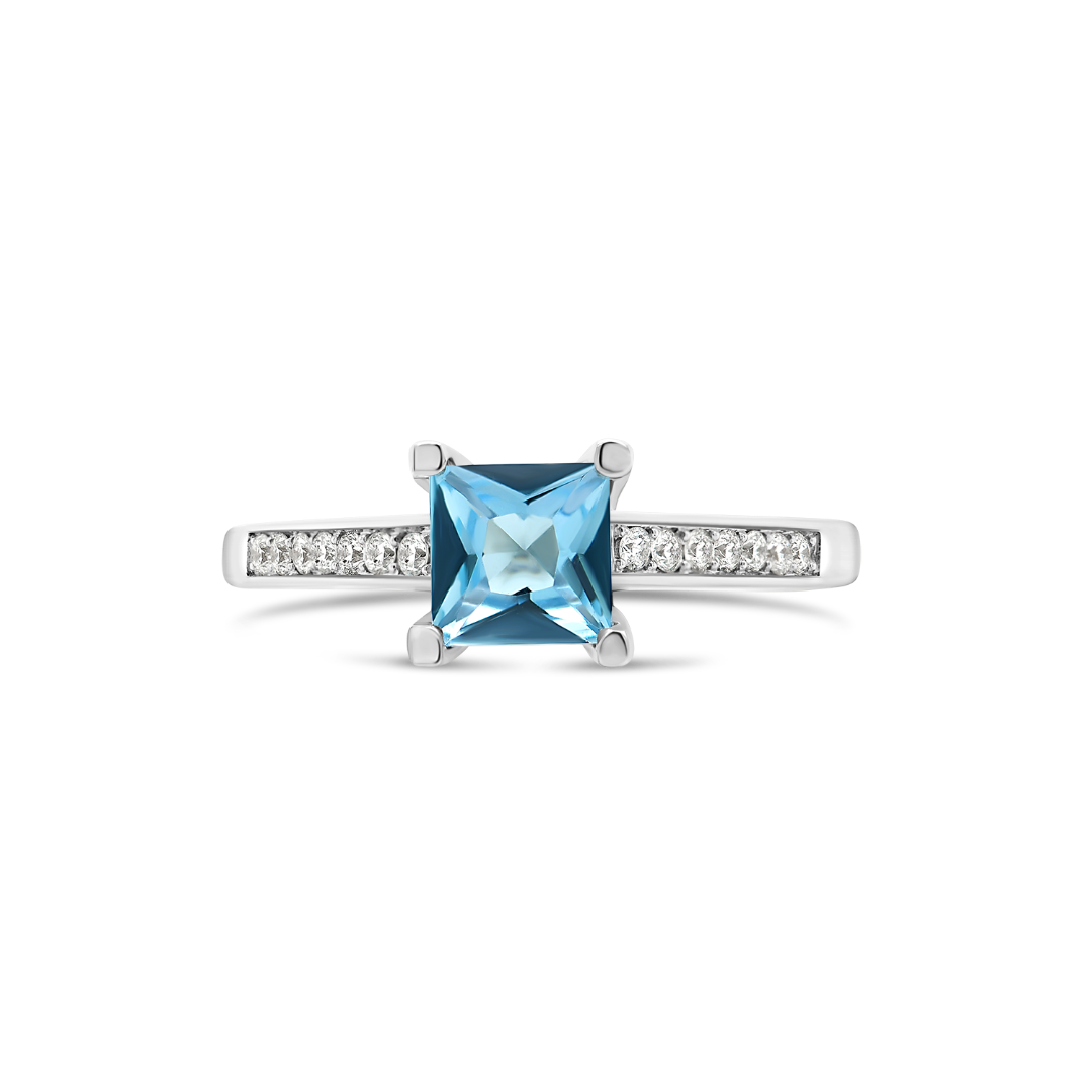 Inel din aur alb de 18K, încrustat central cu un Blue Topaz de 0.75ct și 14 Diamante naturale Round Brilliant de 0.11ct.