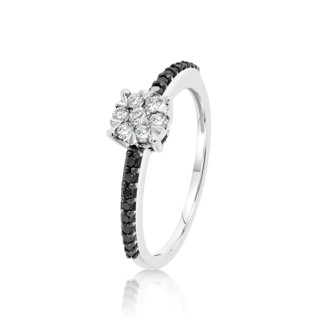 Inel cu Rodiu negru din aur alb de 18K, încrustat cu Diamante incolore de 0.16ct și Diamante negre de 0.08ct.