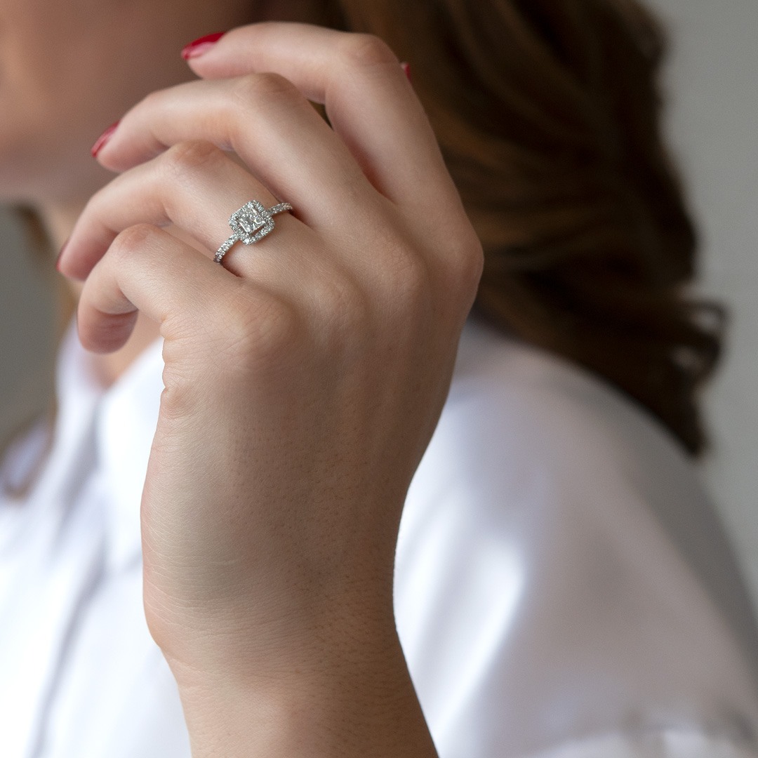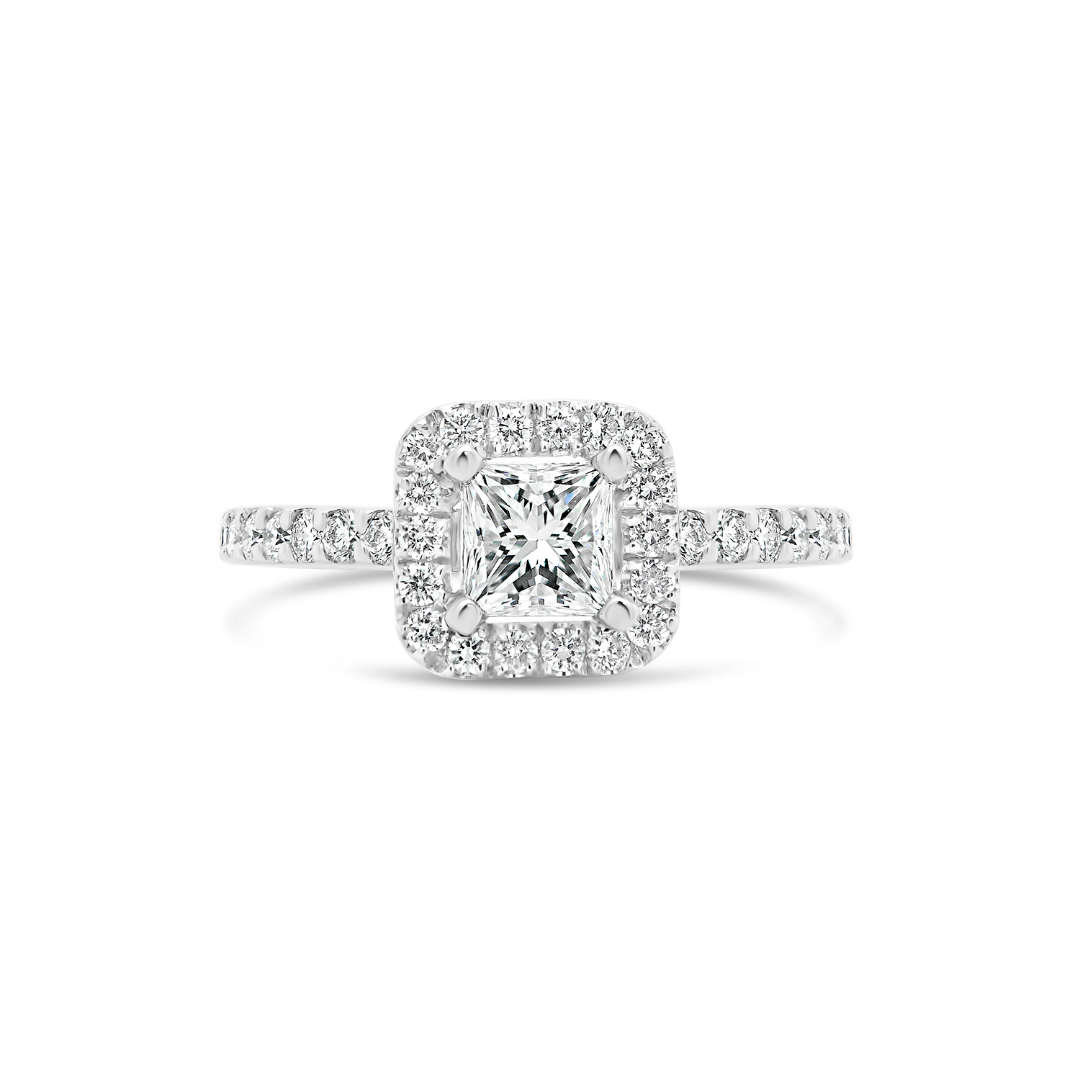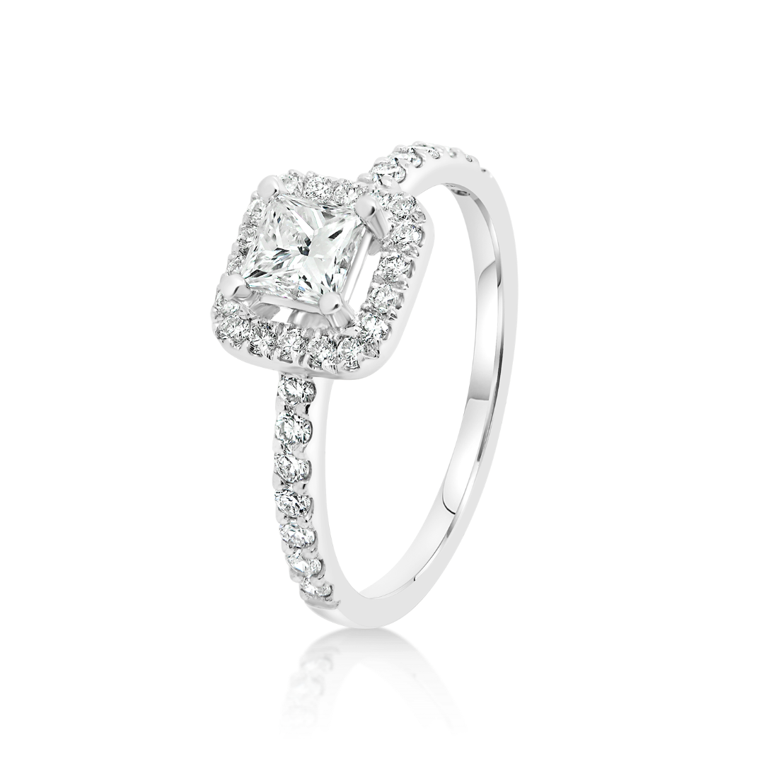 Inel de logodnă din aur alb de 18K, încrustat central cu un Diamant Princess de 0.41ct și 32 de Diamante Round Brilliant de 0.37ct.