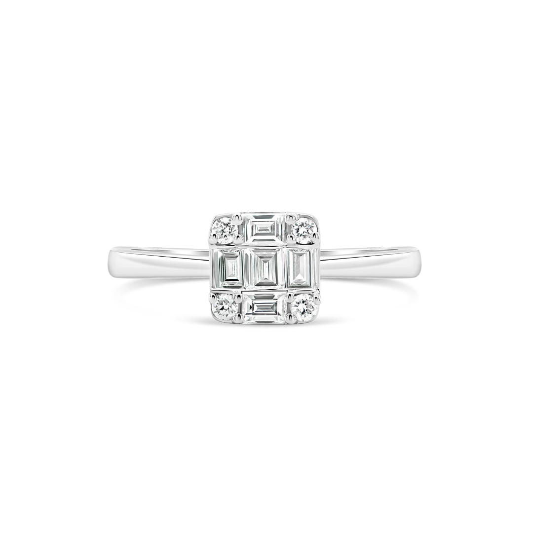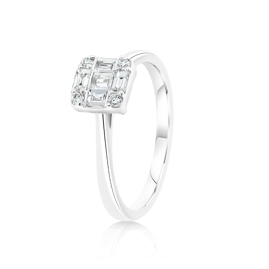 Inel de logodnă din aur alb de 18K, încrustat cu 4 Diamante Round Brilliant de 0.06ct și 5 Diamante Baguette de 0.22ct.