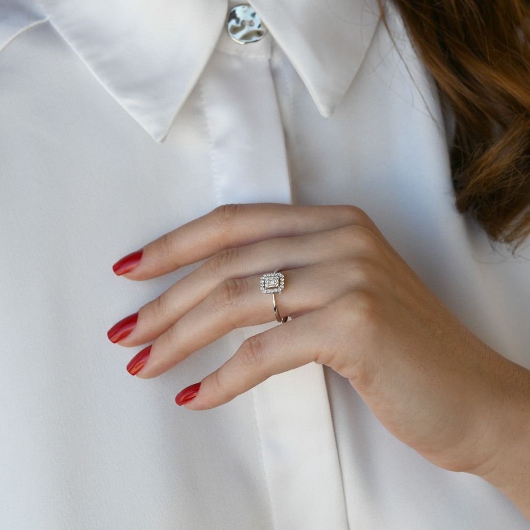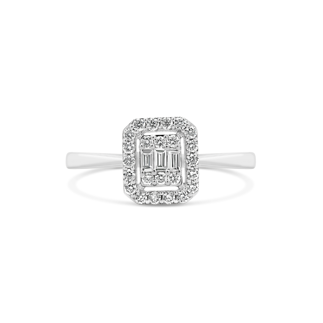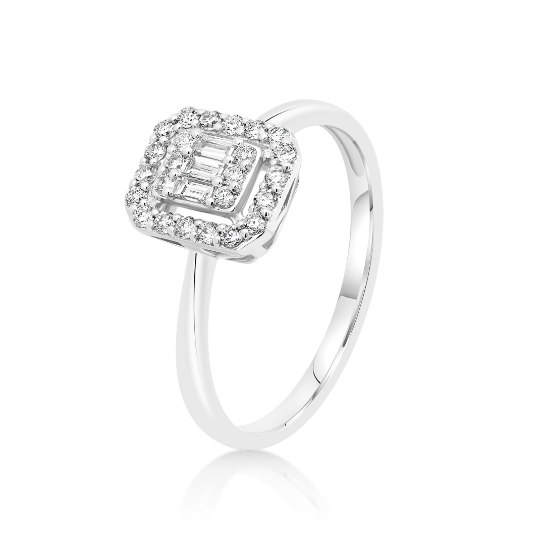 Inel de logodnă din aur alb de 18K, încrustat cu 3 Diamante Baguette și 24 de Diamante Round Brilliant.