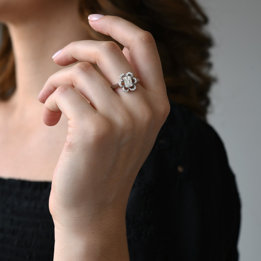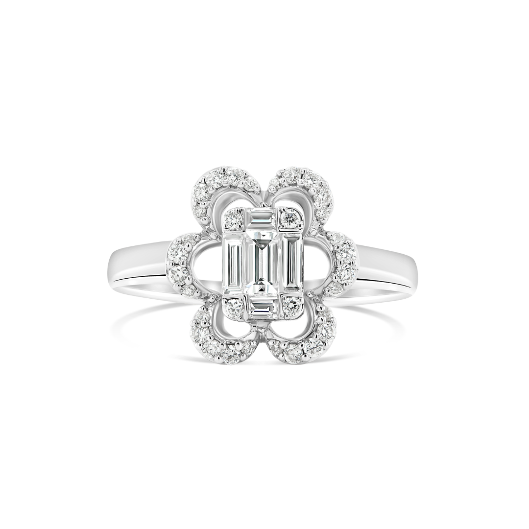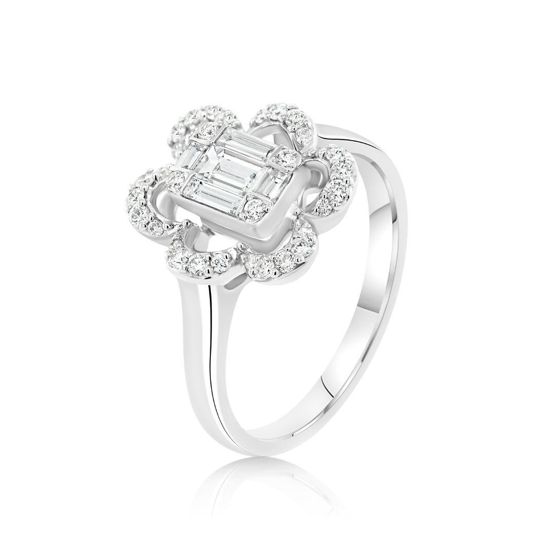 Inel din aur alb de 18K, încrustat cu 32 de Diamante Round Brilliant de 0.20ct și 5 Diamante Baguette de 0.28ct.