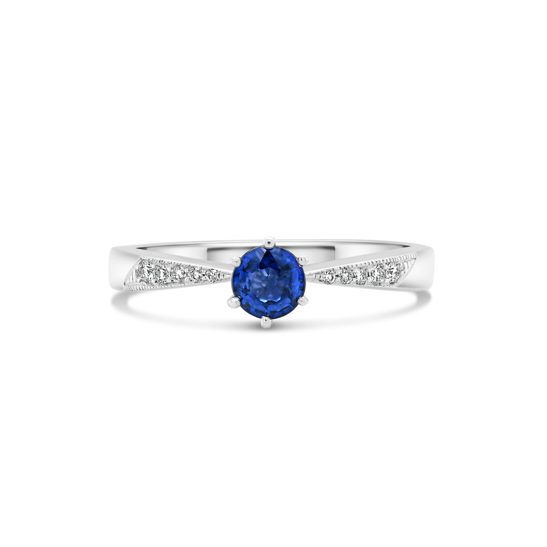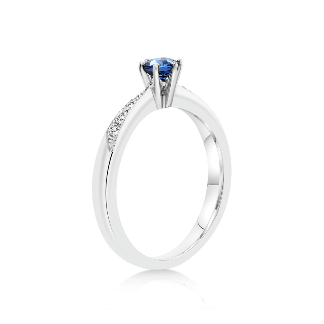 Inel din aur alb de 18K, încrustat cu 10 Diamante de 0.07ct. și un Safir albastru de 0.43ct.