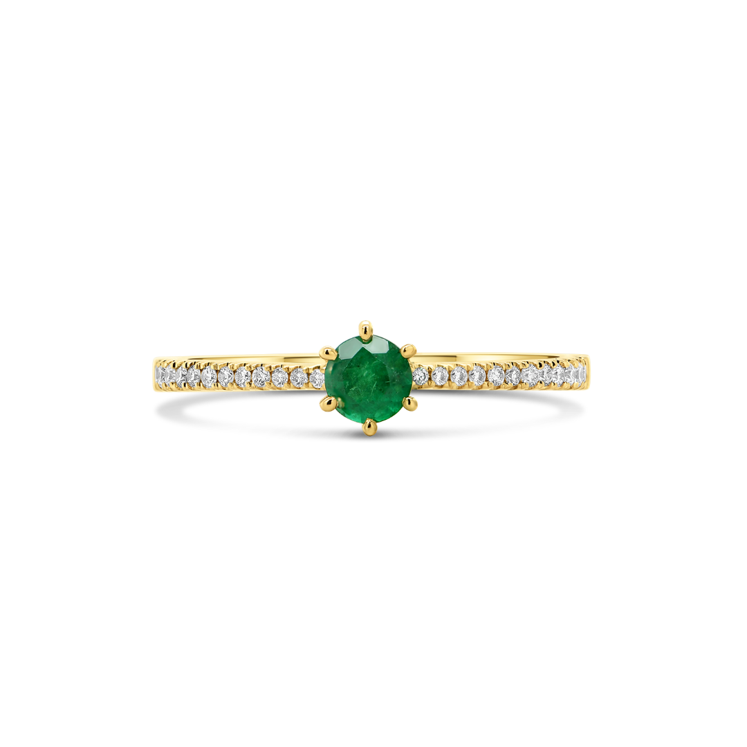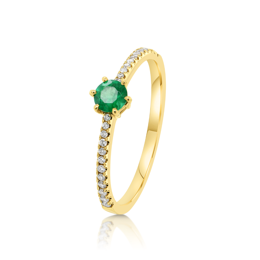 Inel din aur galben de 18K, încrustat cu 24 de Diamante naturale Round Brilliant de 0.13ct și un Smarald de 0.22ct.
